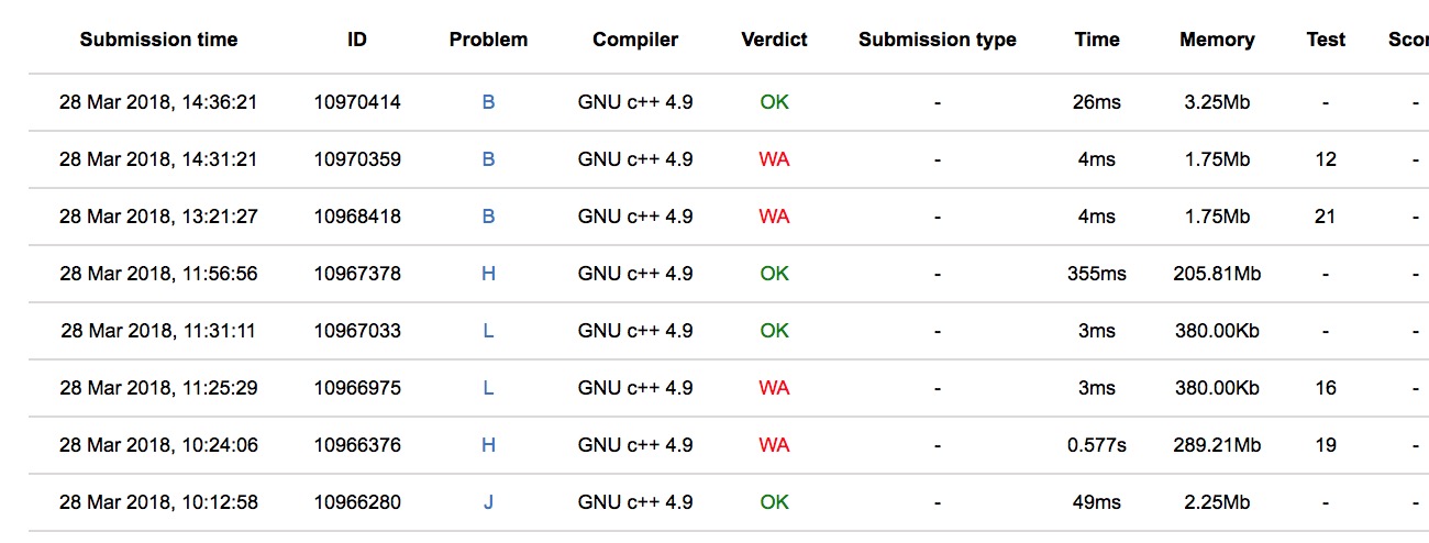 开场cjb读了H,用Treap秒了,决定上去敲个板子艹了,然后J有人过,sub上机J1y32。cjb敲完,yzc补充了一点就交了结果wa,怀疑人生,只好对拍,一直不知道怎么错的,怀疑起了板子。sub表示会了L,上机L2y111。最后终于发现H的问题了,板子有个小地方炸了,H2y136,惨失一血。cjb上机写后缀数组,然后和yzc搞了起来,sub孤独开题,cjb和yzc又wa了,最后sub加入,三个人开始乱搞,最后完场前4min过了,B3y296。