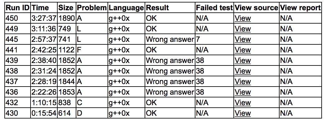 开场各自看题,cjb和yzc讨论了D,D1y15。cjb上机敲后缀数组,之后yzc上机后发现和cjb的I做法有问题。sub上机敲C,C1y70。之后cjb上机敲A的线段树,sub把贡献部分补完,始终wa,找到了好几个bug。之后sub给yzc讲了F,F1y162。sub上机做L,L2y191。cjb和yzc终于看出A的问题,A5y207。之后sub写了E的几何部分,yzc和cjb搞set的部分始终没搞定,就咕咕了。