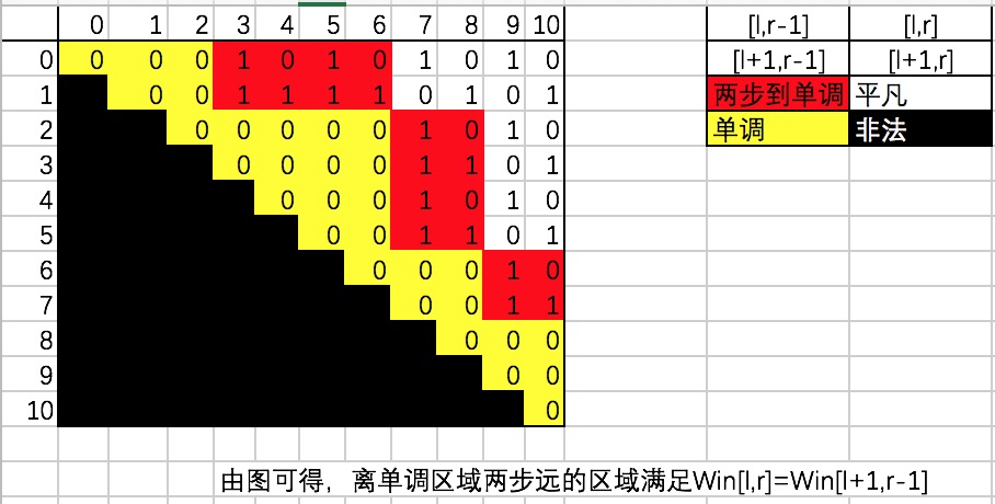 * J:对于一个区间[l,r],若它是单调的,则显然先手必败。若去掉l或者r后变成了单调的,则显然先手必胜。若[l+1,r−1]是单调的,那么同理先手必败。若[l,r−2]是单调的,那么先手若取r会导致后手必胜,后手同理,故两人会一直取l直到出现上面第一种或者第二种情况,可以根据奇偶性判断。同理可以得出是单调的情形的处理方法。除此之外,有[l,r]的答案等于[l+1,r−1]的答案,二分找到最小的k满足[l+k,r−k]可以由上面方法直接判断出胜负即可,另有一条式子win[l,r]=(!win[l+1,r])|(!win[l,r-1])。ps:至于为什么[l,r]=[l+1,r-1],其实我觉得一点都不显然,问了下Claris和秋少,他们也不懂....咕咕咕 .......然后我画了个图,似乎能prove了。[[BR]]