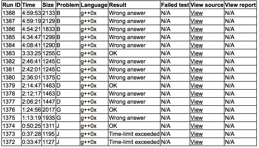 开场各自看题,cjb上机写J,tle了两发,发现写搓了,'''J3y50'''。yzc上机写G,wa了,发现题面读搓了,'''G2y84'''。cjb上机写D,sub帮忙刚了刚转移,wa了之后发现排序的cmp错了,'''D3y134'''。yzc上机写C,wa了之后只好让sub上机对拍,之后'''C4y213'''。之后cjb上机敲了三维凸包,然后让yzc上机写B,wa了好多,刚到了最后,无果,赛后发现细节炸炸,过了。现场rk 39,炸成翔。