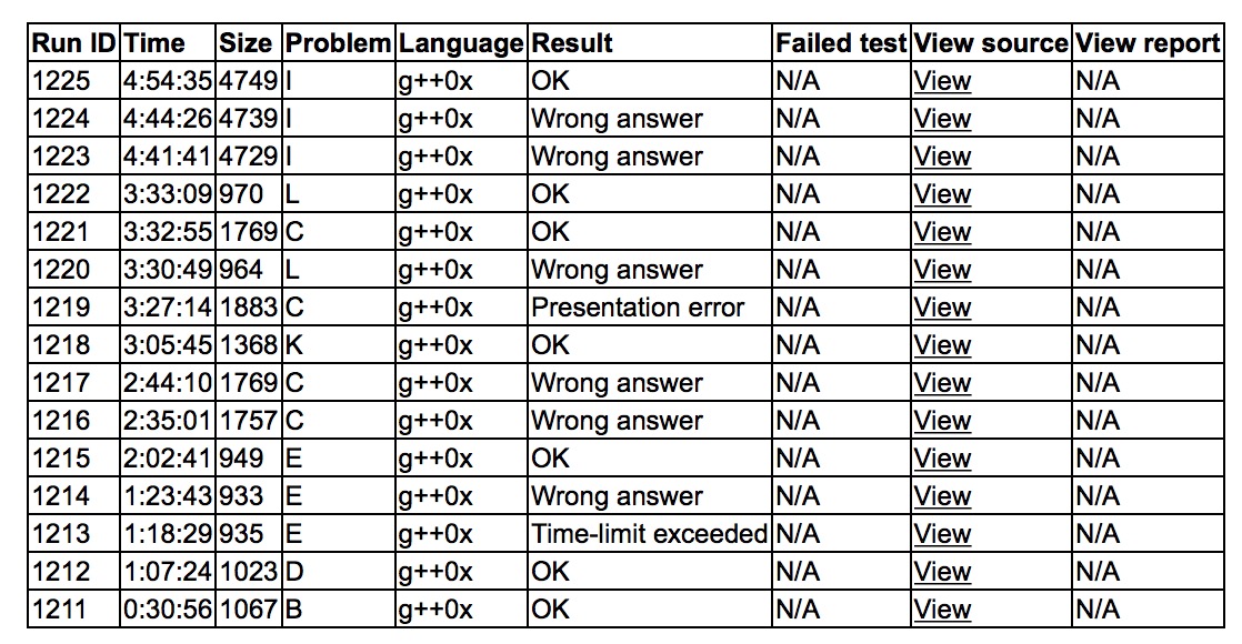 开场各自看题,cjb读到了sb题B,和yzc开始逼逼,yzc上机B1y30。sub痛苦搞D,上机D1y67。cjb和yzc口胡了E的答案很小,cjb上机tle后wa了,之后sub和yzc搞K,cjb感觉事情不对,改成迭代加深过了E,E3y122。sub此前开了C丢给yzc,yzc上机wa了两发,cjb开出了K,上机K1y185。cjb开出了L,yzc和sub终于发现了C的bug,上机又Pe,cjb 交了L wa了。之后cjb和yzc同时发现自己的辣鸡bug,C4y212,L2y213。之后yzc上机写I的预处理,sub之后上机写扫描线,wa了两发后找到了问题,I3y294,最后现场榜rk 6。