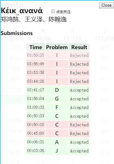 流水账:这次校赛,一开场我们决定wyz从头看,chy从后往前看,我看中间,一开始chy直接冲到了座位上开始敲J题,wyz好像也很快知道了A题是个签到题,平稳地签掉了前两题之后chy看了B,wyz看了C,而我找到了F题,写了一下转移方程,chy认为B题可做,并且写了个马拉车上去,wyz则做C题,我在其间拿到了机子敲上了F题,此时感觉状态不是很好,不是很适应计算中心的机器和环境,就写得有些慢了,我敲完F后(未调通样例),我和wyz开始交替写C和F,chy则想B和找新题开,一段时间之后我调过了F,wyz过了C,我们也很快发现G题是个大水题,决定chy攻B,wyz写G,我看别的题。然后经过一段时间的调试wyz过了G题,chy接着写B题(其间chy发现原来做法有问题,我给了个排序+并查集的做法,chy重新觉得可做),我觉得E题是个不可做题,让大家别碰E题,然后就剩下H题和I题了,H题是个可能要写很长代码的码农题,问wyz能否一个小时写完线性复杂度的建表达式树(带是否有括号标记),wyz表示不行,于是决定做B和I题,在剩下80分钟的时候,chy在调B题,我看了下榜发现连学军都还没过,于是让wyz重新看一下题意,wyz跟我表述了一下题意,chy发现有不一样的地方,然后我们就发现B题的题意出错了,于是果断转头去做I题,剩下一个多小时时间里大家在欢声笑语的乱搞中迎来了gg。