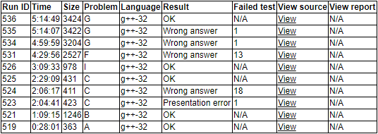 流水账:今天一开场得知chy有点不在状态,然后正常开始了训练,其实说实话好像大家都有点不在状态。开场,我从后往前看,chy看A,wyz看B,我很快看懂了K的题意,打算和chy讲,chy表示开场签到,还没想好的话就先不用交流,我觉得很有道理,K题没什么思路,接着看题。wyz表示B题可能是个水题,如果没人有更签到的就敲了,大家表示赞同,然后我就开始随机看题,结果硬是看不懂C题题意,在怀疑人生了一段时间之后大家发现A题B题C题都有人签到了,感到有点难受,一会儿之后从chy那里接过来A题,发现是个很傻的DP,在写好了转移方程和边界条件之后我就上去敲了,稍微调了两下就过了。看了一下时间觉得心态有点爆炸,在wyz调B的时间里,我和chy讨论了D题和K题,K题已经化成了在树上加边的模型了,而D题已经出了在凸包上挨个删点的做法了(只做删掉点相邻两个点之间的凸包即可做到这部分O(n)),看没人写D题,觉得还是挺合理的,因为几何题细节多,但是我们没什么题可以做,就让chy写D题了(并且甚至期望能够拿一血……)。然后一段时间过去了wyz解决了B题,好像是复杂度估算错误……wyz在读了好几遍之后给我解释了C题的题意,我猜测把所有在一个数后面比它小的数赋值为它即可,然后觉得可能不太稳,于是多想了一会儿,在莫名其妙的一段时间过后,和wyz讨论得到了相同结果,光荣地浪费了时间。wyz在WA了一发PE了一发之后才过了它(此时可能是C和D交替调)。在好不容易过了C之后,我在理解错I题题意浪费了半个多小时之后才理解其真正题意,和wyz讲了他疑惑的部分,wyz开始做I题,chy继续调D题。其后我把chy的K题做法补全了(即如何维护两点之间简单路条数),chy认为他得到了F题的做法(我也觉得蛮对的)。于是就等wyz的I题做好了,chy将F题优先级排在了K前面(因为过题人数),wyz敲完I题之后就让他选了其中一题去敲了(他选了F题),我则觉得G题很签到,稍微写了一下G题的式子,等待F题过了就和K题一起写。然后F题一直gg到最后半小时(然后发现算法有问题)。K题肯定没法写了,就决定写G,写了一会儿之后觉得我的手速可能没法力挽狂澜(其实已经弃疗了),就让wyz写了。然后在最后10s时交上去了(因为抄错了我的式子(多打了个'/2')WA了)。赛后找了一下错发现了这个错误,改了一下就过了。