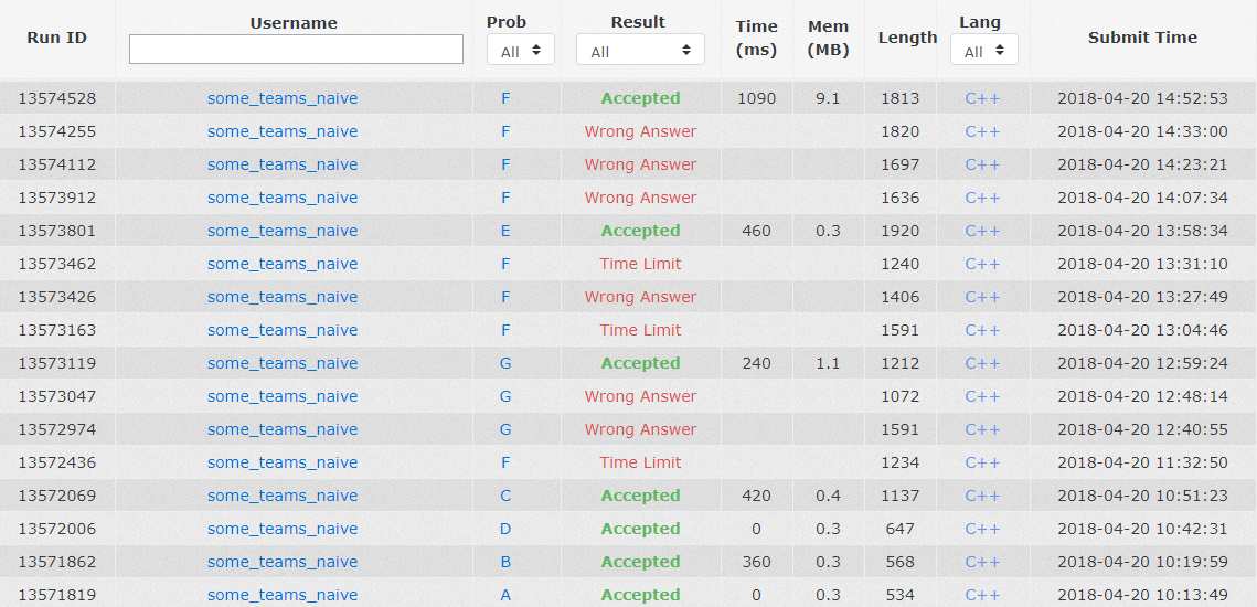 流水账:昨晚询问了一下lsmll学长省赛是不是有训一下的必要,被表示还是可以训一下的,于是就有了今天这场训练。开场wyz从前往后看,chy看了E,我从后往前浏览了一下,wyz很快就去签A和B了,一会儿之后我知道了D的题意,就在wyz签了A和B之后上机了,先写了个尺取法的,然后好像出了点问题,就随手改成了n2的写法,平稳地签掉了,C很快也被签掉了,我和wyz讨论了F题做法,chy的E也基本可以确定是个普通的数位DP。然后就决定chy敲E,wyz敲F,我则开始做G题,在他们调E和F的时候我写了一下G的分类讨论,占用了一点机时把代码写了个大概,打出来手动补全了。wyz的F题TLE了,我跟他表示了一下常数优化看看,我交的G也WA了一发。然后wyz改好了之后开心地把F交到了我的G上,这是我在A了G之后发现有两发罚时的时候发现的。然后就是我发现分类讨论的一小步出了错,稍微改了一下就AC了(然后发现F交到了我这题上)。此时还有两个多小时,觉得还行,帮着wyz一起调F题,chy则终于发现E题的错误(题读错),一段时间之后我觉得可能还是要重新读一下F题,于是我们惊喜(xia)地发现F题也读错题了,但是能在原代码的基础上简单地改成正确的。之后就是wyz改了一半代码喜获WAWAWA的盛况了。不过好在最后还是发现了bug的所在。也没有什么时间来做H了。