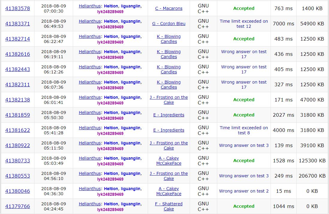 开场lyk看到K是个裸的旋转卡壳,码的差不多了,被队友赶下来签到F1y19。heltion和jhguai讨论了下A题,写了一发WA了。lyk看到J题是个裸的FFT,上机码了一发,发现板子有问题,WA了几发。之后heltion和jhguaiFIX了A题的做法,A2y58。之后heltion和jhguai又想出了E题,WA了一发后就A了,E2y105。期间lyk放弃了纸面debugJ题,去开其他题,马上会做了C题。队友过题后腾出机位后,lyk上机试了试数据,发现fft爆longlong了,改了就过了,J3y116。之后lyk继续写开场就想的K题,过了样例就交,发现各种傻逼细节有问题(sgn返回类型为bool,去重点未排序,点到直线函数三点顺序写错),改了三次才过,K4y137。这时heltion和jhguai想出G题,写了一发费用流,TLE。换lyk写C题,10分钟就过了,C1y175。之后jhguai抄了个km的板子,又是RE又是WA,lyk让jhguai换个板子,终于过了,G6y248。期间lyk和heltion想到了B题的一个奇怪的做法,觉得复杂度有保证,在jhguai写完G过,lyk上机一顿敲,写完稍微debug了下XY的问题,马上过了样例,交了就过了,B1y279。之后就弃疗了。