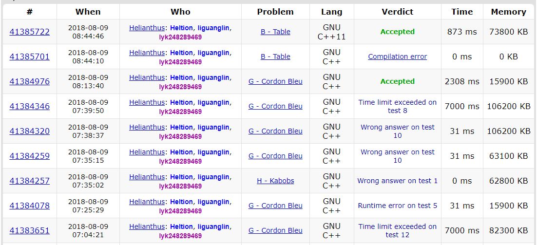 开场lyk看到K是个裸的旋转卡壳,码的差不多了,被队友赶下来签到'''F1y19'''。heltion和jhguai讨论了下A题,写了一发WA了。lyk看到J题是个~~裸的FFT~~,上机码了一发,发现板子有问题,WA了几发。之后heltion和jhguaiFIX了A题的做法,'''A2y58'''。之后heltion和jhguai又想出了E题,WA了一发后就A了,'''E2y105'''。期间lyk放弃了纸面debugJ题,去开其他题,马上会做了C题。队友过题后腾出机位后,lyk上机试了试数据,发现fft爆longlong了,改了就过了,'''J3y116'''。之后lyk继续写开场就想的K题,过了样例就交,发现各种傻逼细节有问题(sgn返回类型为bool,去重点未排序,点到直线函数三点顺序写错),改了三次才过,'''K4y137'''。这时heltion和jhguai想出G题,写了一发费用流,TLE。换lyk写C题,10分钟就过了,'''C1y175'''。之后jhguai抄了个km的板子,又是RE又是WA,lyk让jhguai换个板子,终于过了,'''G6y248'''。期间lyk和heltion想到了B题的一个奇怪的做法,觉得复杂度有保证,在jhguai写完G过,lyk上机一顿敲,写完稍微debug了下XY的问题,马上过了样例,交了就过了,'''B1y279'''。之后就弃疗了。