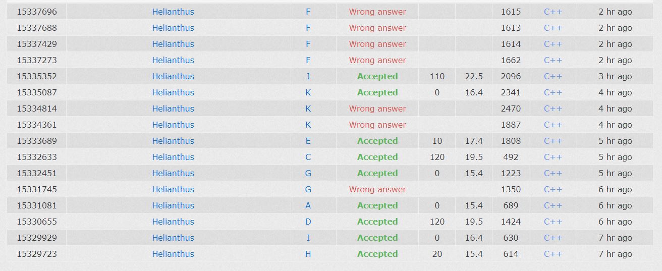 开场签到'''H1y15''','''I1y22''','''D1y47''','''A1y61''','''G2y100''','''C1y105'''。之后E也是个沙比题,一发就过了'''E1y136''',看到后面人全WA了很开心。然后JK两题几何题,先写了屯了一年的K题,WA了两发才发现拦截是垂直不是任意的,之后就过了,'''K3y199'''。J题一个凸包就没了,'''J1y213'''。之后只剩BF两题,可是题目都屎一样长,全部读错了题意,妄图用错误的算法过F,WA了4发,收尾。