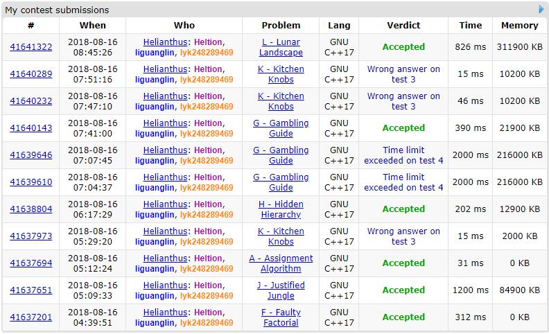 开场换了顺序,lyk从中间开始看,heltion后面,jhguai前面。lyk看了F题,跟heltion讨论了初步做法,写完跟heltion测了测几个数据,debug了几下,F1y19,第二次抢到一血。之后heltion看到J题,跟lyk说了下,lyk秒了,J1y49。期间jhguai的A题也写好了,A1y52。lyk跟heltion看了看K,理解错题意,还写了个错误算法,WA了一发。之后给heltion写模拟题H,我下机看K,发现算法错了,继续想。heltion写对了H,H1y117。之后heltion和lyk讨论出G题做法,TLE4,下机看代码。中间jhguai在K题第二种错误题意上想了个正确的解法,写了一发。中间heltion改了改G题,G2y201。jhguai也交了发K,WA3。之后lyk和heltion开始一起写L题,大力讨论三种情况,写了快一个小时,调过了样例,交了一发,L1y265。之后跟jhguai一起debugK,写了个错误的对拍,对拍无果。