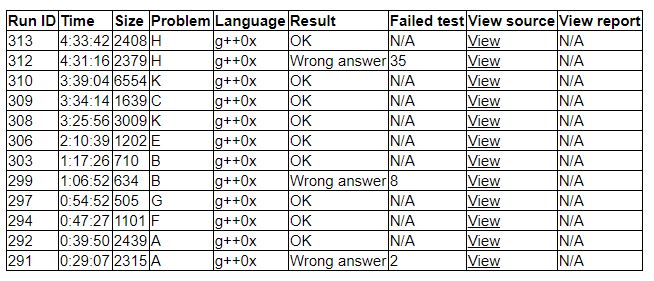 点开start就卡住,以为没开始,其实开始了,晚了五分钟。lyk看了A,写了一发,WA。heltion上机写F,写到一半换lyk改了改A,'''A2y39'''。heltion写完F又写了G,'''F1y47''','''G1y54'''。jhguai上机签B,因为接到空的后面时,链表尾指针没有重新赋值WA一发,'''B2y77'''。lyk和heltion讨论了E题,积(bai)分(du)出了扇形重心公式,lyk写了一发,发现比想象中好写很多(环状区间dpGET!),调了调过了样例,'''E1y130'''。jhguai上机乱搞K,没过样例,下机。期间lyk和heltion讨论出了C,上机快写完了。jhguai发现了错误,测试了几发,大数据比较慢,莽了一发,居然过了,'''K1y205'''。lyk继续上机写C,过了样例,查看了中间过程,确认无误,交了一发,'''C1y214'''。之后一起讨论了H,是个2SAT,讨论后得出3种情况的判断方式,jhguai上机,调了调过了样例,交一发WA了,发现坏孩子可能以前没出现过,fix了下,'''H2y273'''。
