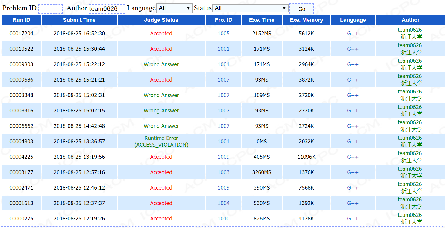 开场过了两题后评测机炸了,又写了三题后发现1001题做法错了,FIX的时候写了1007。数组开小了,初值一开始给大了。[[br]]
