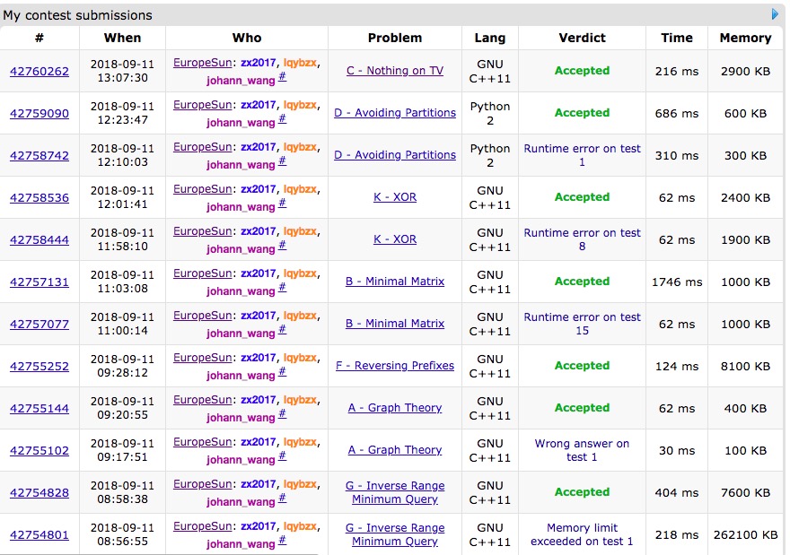 想好了我上机写,不太顺,加起来A掉花了90min,其中sort相等返回0,re了一发。之后卡K,D,和欧阳想了会K交给欧阳,[[br]]