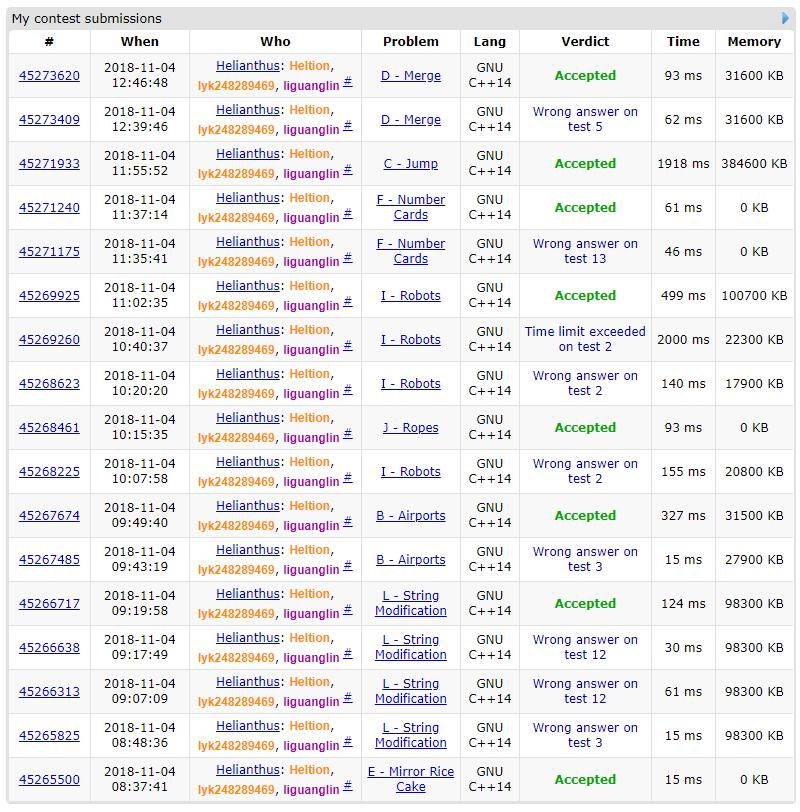 开场heltion签到'''E1y3'''。lgl签到L,'''L4y45'''。lgl去写了B的曼哈顿距离最大生成树,'''B2y75'''。lyk看到I题有人过了,觉得是个沙比题,WA了一发。heltion推出了J的式子,'''J1y101'''。lyk发现I题链的做法有点问题,改了改I,果然TLE。之后发现可以跑最短路,重写了一发dijkstra后过了,'''I4y148'''。之后lgl写了发F,'''F2y183'''。heltion突然发现C题是个最短路,lyk又写了个dijkstra,'''C1y201'''。之后试了试D题的DP,一顿尝试发现某个系数是卡特兰数,'''D2y252'''。之后想了想H,没有想出来。