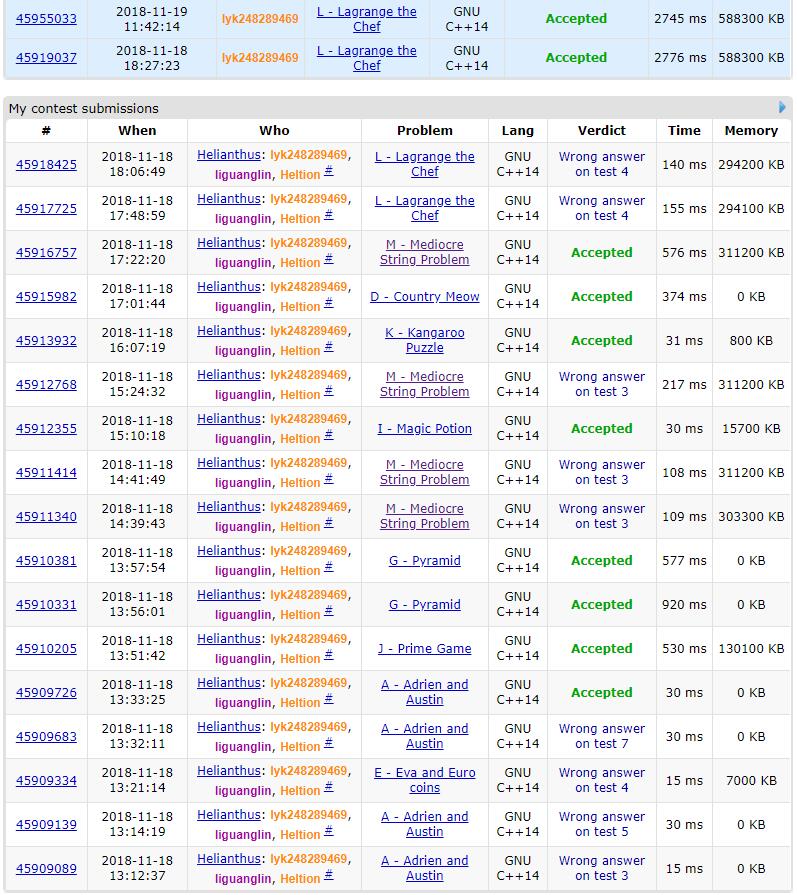 这套题感觉还行。D题被heltion的模拟退火水了过去,还行。中期屯了好多题。jhguai的M题因为抄的板子错了拖了很久。我中期以为想清楚了H题,以为只差最后一步,其实还有别的地方没想对。最后写了L题的DP,基本思路是对的,但是没有考虑都一个很简单的corner case,赛后很快就过了。