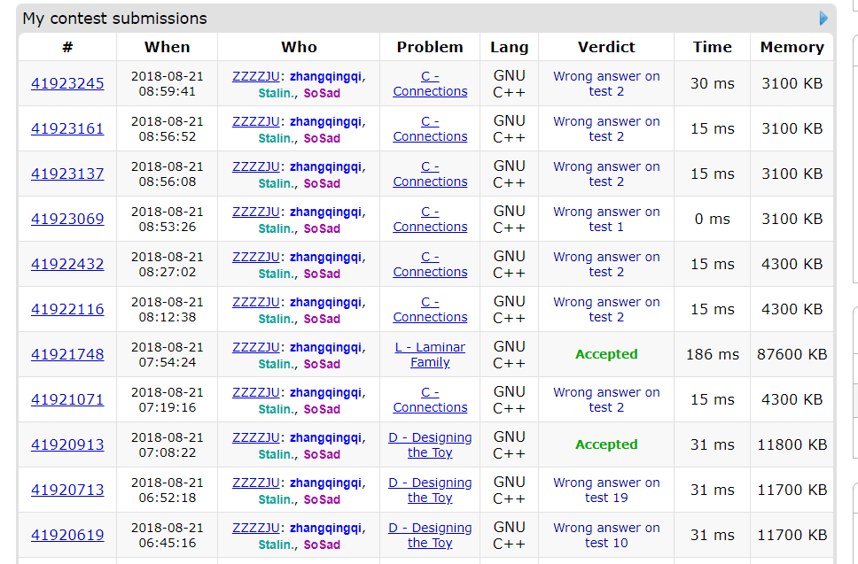 今天的C题卡了之后我没有深入的思考,只是听了zqq的做法觉得对之后就帮着看代码了。另外zqq调C太久我应该及时喊停,大家都是为了队伍好没必要顾忌太多的。如果冷静一下再思考可能不会一直卡住。