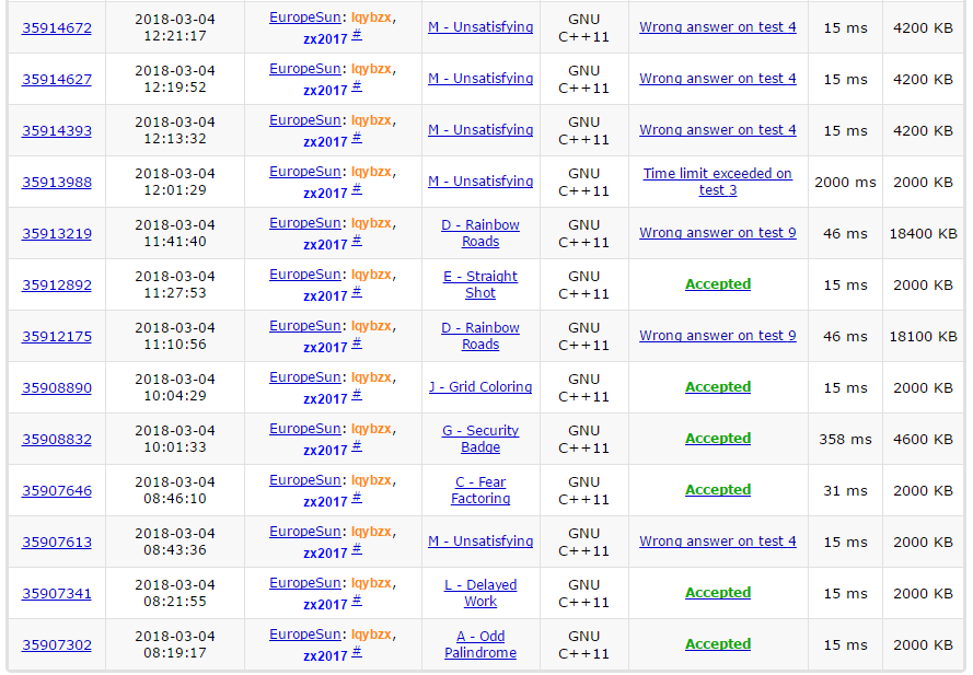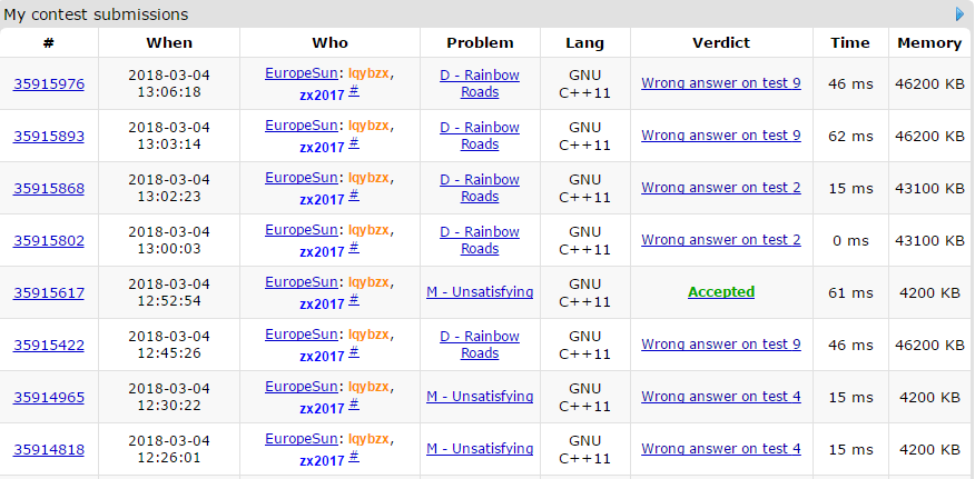 M题改成平方复杂度以后就一直开始了WA4,又发现了许多少考虑的情况。同时D题也发现许多问题。改了一发还是WA9。[[br]]