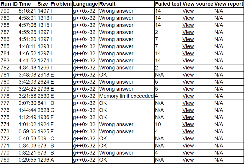 一开始A题打错4个变量名,B题打错1个,F题数组开小,G题一次过,中间推了D的公式出来也过了。[[br]]