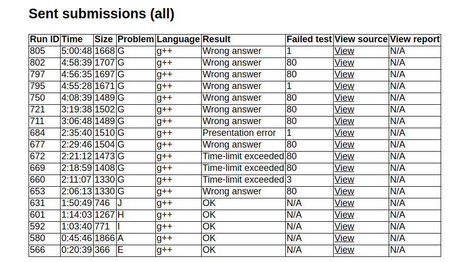 5道签到级别的题都过得比较快,而且都是1A。G题有了思路但是一直死在了精度上。中间调了好几次eps都是在WA和TLE之间来回蹦跶。封榜之后又想到了其他一些改法依然没用。