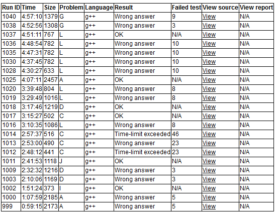 今天是跟女队一起训的,一上来周哥冲上去写了A题,但是不对,我看了看I题并没有什么思路,于是拉着学姐一起写D,D看起来就是一个分类讨论的麻烦题,但是还是觉得自己能快速通过就上去写了,写完了学姐告诉我少考虑了情况,于是删除重写,一直WA。周哥看了看I题想出了做法,上机1A,我看了眼J题也想到了做法,上机1A,然后开始调D。周哥上机写C,算错了复杂度,边T边WA,加了剪枝以后通过,学姐发现了D有一个初值没有减,改过后通过。时间还剩1.5h,我看错了L题意,冲上去写了一个错误算法,周哥找出A的反例,改正后通过。最后一个小时我们决定分头开题,周哥学姐去搞G,我去开L,最后我交了5发通过了L,周哥G差一点,WA9。