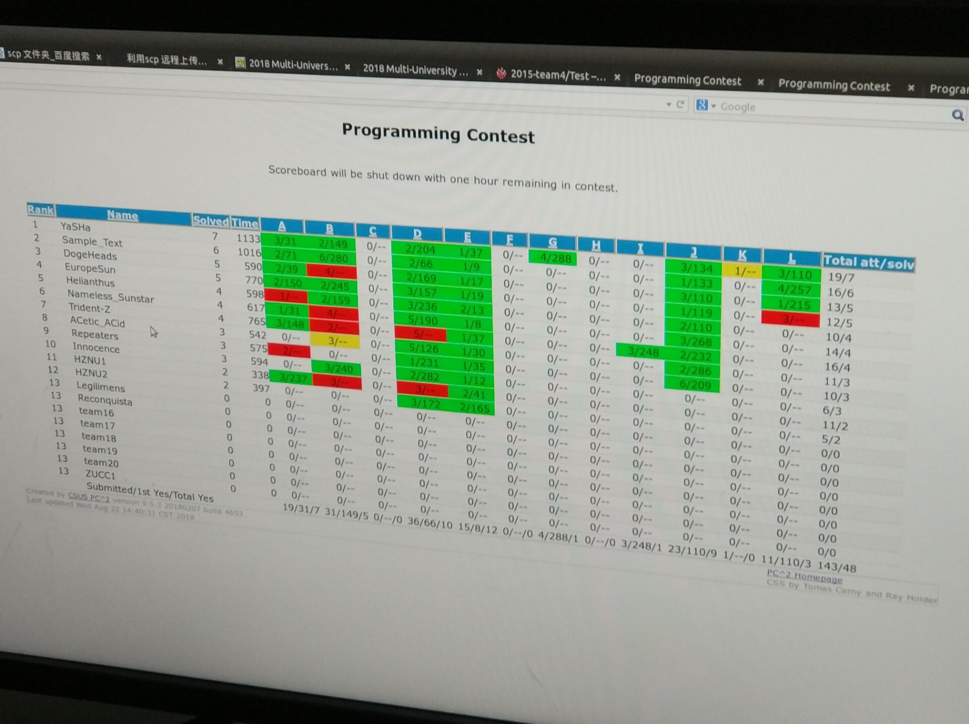 hyy立刻发现了A题的公式是几天前退出来过的,于是让lyc回忆公式赶紧写出来,可惜由于lyc脑残没开longlong而WA了两发,hyy与dhr在lyc脑残的时候看榜发现了签到题,hyy立刻把签到题碾了过去