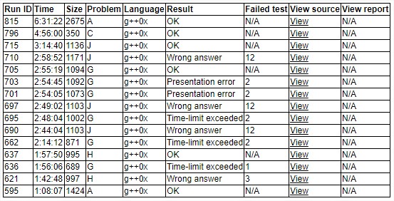 经典三开读题,三人看了一圈题目,dhr发现签到题E,眼看榜上过得刷刷刷,dhr便上机写之,代码有一些些错,E10(1)。hyy被lyc问到I题题意,发现是签到题,写到一半的时候发现题意有写偏差,改过来后还是错,仔细想想I38(1)。dhr这时大力开出了hyy看了之后直接弃了的A,刷刷刷就切掉了A68(0),以至于hyy现在才发现这道题是这时候被a掉的。其后hyy想出了G题做法,lyc上机写H。H题出师不利,hyy和两人讨论做法后上机写G,亦挂。H题马上就调出来了H97(1)。但hyy交了一发后发现第2个点还是有问题,听到大家都是wa80,非常难受。dhr发现J是水题,切J大师上机,wa。hyy交,没什么变化。hyy又对精度和0等等问题做了调整,终于变成pe,结果这个时候是fflush的问题,又交又pe,结果发现少了感叹号,脏脏地过掉了G175(5),dhr也终于切了J194(2)。