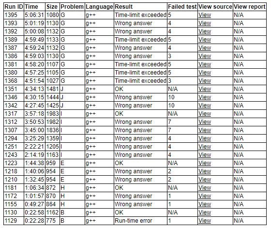 于此同时lyc在自闭读题之中,读懂了E题的题意。dhr跟榜写了H的代码,WA后求lyc帮忙查错,在查出n个错误(n>1)之后通过了H,H66(2)。