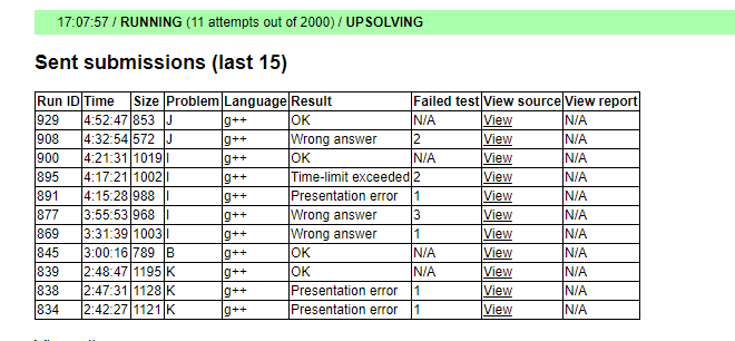 感觉这场开题顺序不太对,K是几何题全队都比较烂但是因为先有想法就先上了,B边界抠的也有一点麻烦但是也是直接上了,而且这个时候一个人在写另一个人居然还在想这题怎么做,我(yrb)觉得有点浪费,这时候应该要么开题要么构造样例的。I同时两个人上多挂了好几发,还好队友想出了J并且顺利过掉,死相没有太难看。