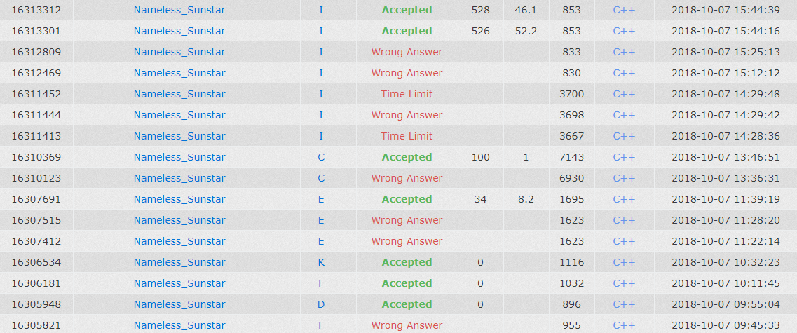 zhhhplus: 上来我们发现D题和F题是签到,我读D题,cyw读F题,然后cywF题签到失败,我上去签掉了D题,一会儿之后帮cyw找到了F题的问题(题目少读个shown),然后大家发现E题I题和K题有人过了,我上来表示K题先打个表看一下,发现2e9以内就只有题目给出来的样例2,猜测了一下之后再也没有了,然后写了一发就过了,场上第8个过。然后lsy写E题,一个小时之后过了?中间cyw似乎想到了一个I题的线段树做法,然后叉掉了自己,我则看了一下C题,感觉了一下是个上下界费用流,但是我不会这个,也没找到板子,和cyw说了一下cyw表示自己也不会?(明明只是把dfs换成dij而已啊?)之后突然懂了……之后就是cyw敲C题的板子,lsy推出来I题的公式也写了一发,然后I题好像什么地方推错了,C题调了一下才过。H题我明确表示不会。在cyw写C题板子的时候,我稍微看了一下lsy的公式,直接怯场了……??我莫名觉得lsy这样推出来的应该没什么问题?但是lsy表示这样复杂度不太对,要把里面的某个东西换成O(1)的,我表示O(logn)行不行,cyw表示1e9+7模数的FFT可能不太好写,我就收回了这个想法,然后最后还剩半个小时的时候我感觉不写这个FFT优化也不行了?就让cyw抄一下板子,在lsy原来的代码上加了个优化,然后喜获TLE。