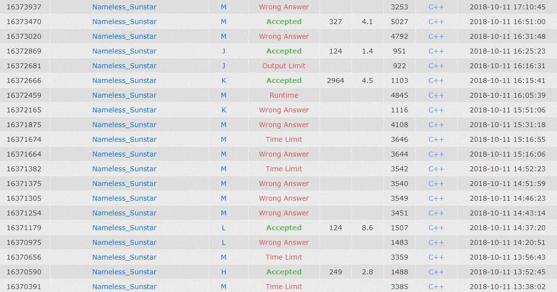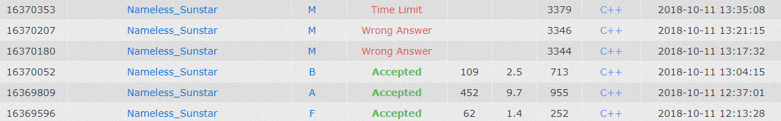 zhhhplus: 上来我读了M题,发现是个随机一下就能过的几何题,然后因为某两个会gg的bug,一路WA或T到最后半小时,中间lsy和cyw十分给力,把该开的都开出来了,然后cyw发现了那个bug,然后就8个题了。我除了看了某几个题和口胡了H题的一个假算法之外就只有躺着什么都不知道了。
