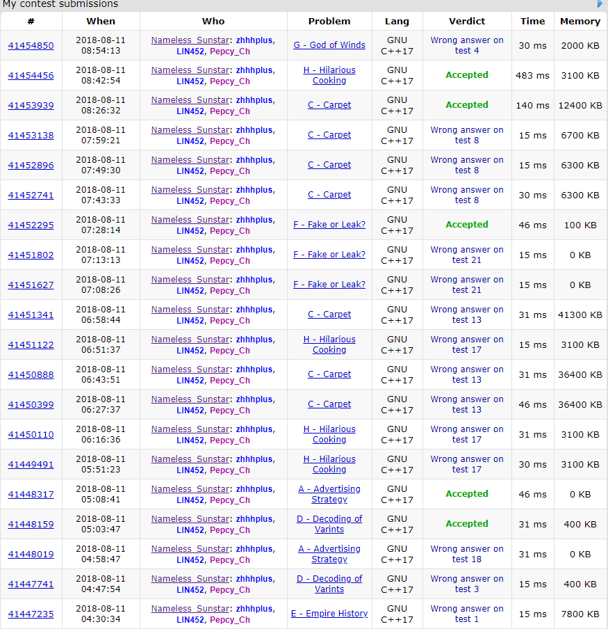 zhhhplus: 今天开场我从后往前看,一开始就看到一个几何题,感觉不一定能在场上写出来,于是果断地决定不写这题,但是看到I题,觉得一定会用到高斯消元,于是上去敲了几行的高斯消元板子。然后cyw告诉我E的题意以及可能能做的写法,当时我们看到了榜上过的签到题有A题和D题,lsy告诉了我A题题意,然后去看D题,不久之后cyw的E题返回了一个WA,然后知道了是读错了题(每日任务?),我得到了一个很虚的A题做法,lsyWA了一发D题,然后我果然WA了一发A题,一会儿之后lsy发现了D题的错误,改了一下过掉了D题,我紧接着改了一点A的做法,也过掉了A题,此时我们得知H题可能是一个签到题,并且也有好几个队过了C题,H题是个很简单但是实现细节可能稍微有点多的题,cyw在这题上花了一些时间,此时还有队过掉了F题,我看上去是个奇怪的模拟题,在我上去写了几行之后心态爆炸了,在cyw调H题的时候和lsy商量了一下C题的做法,没有发现她给出的做法其实有点问题,和她商量了一下决定把F题交给她而C题交给我。接着就是我在WAC题,cyw在WAH题,lsy在写F题,一长段时间都沉浸在WA中非常难受。接着不知不觉lsy就已经把F题过掉了,感觉稍微安心了一点,此时我已经发现了C题的做法是错的,并且提出了一个树链剖分的做法,lsy负责H题的debug(或者重写),然后cyw写的重链剖分我还有点不放心,不过果然重链剖分还是厉害,在我们绝望地调试时大概改了什么东西没交,最后商量了一下交个assert看看是不是输出的方案层数太多,但是居然过了。然后lsy来写的H题也马上就过掉了。此时还剩二十分钟,感觉G题可能是个很简单的题目,I题因为没看到已经保证了原图的线性相关,于是没有想到模2的做法,于是开始对G题乱搞,尽管感觉是很简单的题目,但是剩下的时间实在太少了,于是就没有接着过掉G题或者I题。在赛后写了一点时间就过掉了。