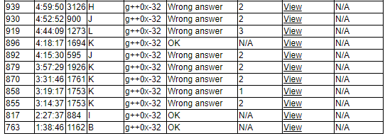 zhhhplus: 今天开场我从后往前读,一路觉得好像都能做,相比较从前往后读的体验应该好上不少。接着凭借做开火车的经验,过了一小会儿就刷新了一下榜单,希望能锁定几个签到题然后就能看到某两个队快速过了B题,但是迫于看榜那台机器的机能,似乎刷新不出最新的榜单。然后就发现B题和I题是签到题,同时可做的有H题K题,似乎还有J题,这些可能是这场的签到题了。然后lsy和cyw自发地讨论起了B题,我则看了一下I题,一边听两人在讲似乎很复杂的规律,一边出来个I题的n^2^做法,因为两人商议让lsy去写B题,而lsy作为DP选手,我也打算把I题给lsy做,于是就把I题先积压着等有空再告诉lsy。大概在B题通过前,我一看这个H题,一看就是一个最小割嘛,然后建了个图,和标算的建法只是多了个把每个点拆开成中间连了无限流量的模型,按理说应该是基本一样的模型(后来WA14,暂时还在寻找错误)。B题签到之后(1A),cyw抄网络流板子,lsy理清楚我的DP方法(优秀地去掉了我多出来的一个维度),此时我看了一下K题,觉得是个很水的枚举边点滑动区间的题目,但是O(n)算法过1e5感觉有点奇怪,就打算等I题H题过了再写。然后到了半场,lsy调过了I题,一发过掉了(1A)。尽管时间有点糟糕(手速需要提升,I题也应该放在B题前面写),但是因为积压了H题和K题,也不是很慌。然后就是cyw写好H题忘记初始化,并且跟我讲我的网络流跑出了奇怪的边,导致我对这个建图产生了怀疑,但是也想不出别的什么很好的替代方法,开始自闭,让cyw去写K题了,我来重新构思一下H题建图的事情。在这之前我和lsy说了本场的目标,HJK都应该做出来,L题因为时间问题可能写不了,如果H题对了,那就cyw写K题,我们来构思J题,但是H题这时出的岔子让我想要回来挽救一下它,跟cyw说过了K题的做法,以为移动区间的说法已经很清楚了,结果似乎并没有很清楚,cyw写的是判断是否相交决定是否入队的。这导致K题也WA了4发,最后调掉的错误似乎是起点和AB点共线的情况,稍微改了一下初始点枚举就过掉了,不可思议。我和lsy讲了一个sqrt(n)的构造方法,感觉非常优秀,因为觉得别的构造方法想出来可能也不太容易,在cyw过掉K题之后就让她去写了一下J题,然后就只有H题和L题可能一做了,在J题果不其然地WA掉了之后,cyw就赶紧去写了一发L题,但是似乎没有解决。然后就是lsy想着J题,我最后想要再抢救一下H题,然后cyw肯定我的做法是对的,就是不会输出方案,我才知道之前更大的问题是输出最小割方案……然后掏出了我的红书说这里面有,cyw用最后的时间敲完了它,在最后10s的时候提交了,但是WA2了,赛后加了初始化之后不拆点获得了AC,但是拆点WA在了14,不清楚是为什么。
