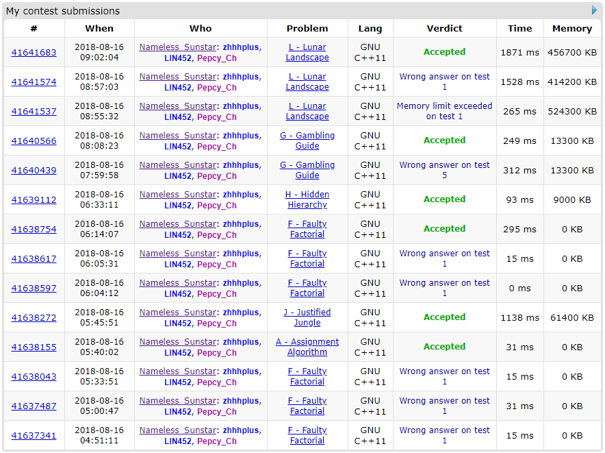 zhhhplus: 今天踩了wyz,开心。至于别的……开场的时候一看F题交的人很多,但是过得不多,可能是个有点细节的签到题,和cyw讨论了一下,决定随便写一个枚举,然后就WA1了,心态炸裂。然后我发现p和2p之间要分类讨论一下,改了一发之后还是WA1,感觉很难受,然后cyw发现了2的情况需要特判,还是WA1,然后我表示F交给我来吧,cyw和lsy先去签到。然后就很顺利地签掉了A和J(都是1A)。然后我去重新写了一下F题,交上去还是WA1,然后我发现我一个地方忘记输出答案了,以及有一个地方把int用%lld输出了,改了一下之后才过掉它。然后cyw和lsy的H题也想得差不多了,cyw上去写H题。接着就只有G题和L题似乎能做。在想了很久之后,lsy发现G题是个从终点开始推的类似最短路的东西,我提供了几个数据来卡掉几个错误,其余的lsy独立就推出来了,十分优秀。之后过了H题cyw告诉我L题可以差分一下来做,感觉很正确,就决定lsy写G题cyw写L题作为最后一个小时四十分钟的目标。接着就在封榜前12分钟过掉了G题(因为cmp手抖写错了所以WA了一发),封榜之后感觉只要wyz不要连过2题,罚时也能稳踩他(嘿嘿)。接着cyw调L题,代码巨方方正正(差分是这样的),在最后半个小时的时候写好了,但是因为奇怪的网络问题导致交不上去了6分钟,换我来点submit就一下子传了上去,然后返回了个MLE1,然后算了一下内存占用,超了4M,去掉了一个从来没用上的数组之后就开心地交了上去,喜获WA1,接着cyw调了一会儿发现之前修改代码的时候没改全,稍微改了改再交了一发,AC了。然后发现只有16分钟了,rush不出剩下的任何一个题,决定到边上摸鱼。