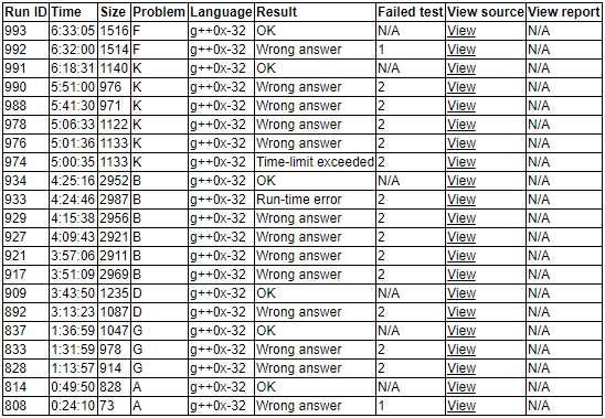 zhhhplus: 今天是一场难度不高的场,但是爆炸得很厉害。今天开场看到榜上有人秒过了J题,以为J题是个签到,然后就稍微看了一下,是个多重背包在有向图上跑,大家发现(点数大于1的)scc里面的点能随意取,以及随便log做多层背包,但是停在这个地方发现过A题的人更多,就先放着了。然后cyw去写A题,写了一发之后交上去结果WA1了(历史总是惊人的相似),接着我来一起看A的代码,没找到什么错。lsy读了G题,我一看这个1e12的数字可以减小到2000嘛,然后随便背包一下乘个组合数就行了,和lsy讨论了一下(cyw也在),接着被指出了一个小错误,大家决定让lsy写G题。在lsy写之前,我想着加个assert交一波A题,在提交页面的时候我愣住了,发现是文件目录没有改,然后过掉了A题。接着我们发现B题过的人挺多的,我一看B题,觉得高斯消元很靠谱,之后稍微优化了一下,把复杂度从1000^3^减到了36*36*1000/64,感觉能过并且很稳,于是让cyw写B题。G题因为爆long long和初始化的锅WA了1次(神奇),然后比较顺利地过了。之后想D题,我一开始觉得像是拉格朗日乘数法搞搞就过了,结果果然每次我想到拉格朗日乘数法的时候一定不是拉格朗日乘数法,然后我放弃掉拉格朗日乘数法,稍微推了一下式子,发现在W取定的时候价值函数是个一次函数,随便统计一下转折点的数值就出结果了。lsy去写这一题,cyw则好好想B题的细节。WA了一发D题之后,lsy发现了代码上的一个小bug,改了之后过掉了D题。接着就是cyw长期的调B题时间,我和lsy想F和J和K题。之后我们发现cyw的高斯消元没有从后往前消元的部分……改了之后接着WA2……之后我们又发现高斯消元之后可能会有一行的开关有多个,这时候要输出“?”,改了之后才过掉……cyw和我讲了他K题的思路,枚举14个点的二进制……我觉得可能枚举19位比较靠谱……然后cyw rush了一下,最后没在时间结束之前过掉它。赛后WA2,并且也不知道是为什么错……改了一下写法就过掉了。