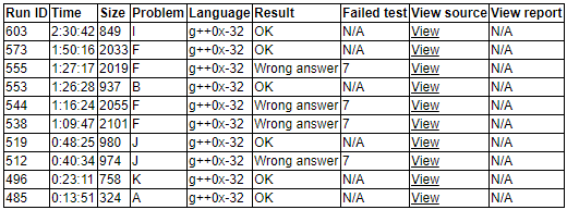 zhhhplus: 今天又踩了wyz!心情舒畅。开场的时候看到一大片人过了A题,然后lsy跟我讲了题意之后我觉得是个CFdiv2A题的水平,就上去快速签到了。1A之后cyw发现K题可以签了,就上来写K题,也是1A。lsy告诉我J题是个暴力搜索,我一听有点虚,然后反正机子没有人占着,就让lsy去写个爆搜看看。WA了一发之后才过,好像是少判断了什么条件。此时看榜过F题的人挺多的,而cyw似乎已经出解法了,上去写F题。我和lsy看了一下榜发现B题可做,以及I题可做,都看了一下感觉不太到做法,B题我吸取了昨天的教训,在想了一小会儿线性规划之后觉得不可能是这个解法,lsy问了我一下线性规划的板子。在cyw WA了两次F题之后我突然发现B题是个sb实数背包,上去写了写就过掉了(中间稍微改了改写法,以求更稳,然后虽然没考虑到a_i_和b_i_可能为0也过掉了)。接着除了cyw的F题,大概可做的就只有I题和E题,E题没什么思路,I题猜测和LIS做法差不多,接着在我想E题的时候lsy得到了I题的做法,也打算上机写,在cyw调完F题代码之后上机写了I题,非常稳地1A了。此时我看了一眼时间,发现还2.5小时,觉得必须再出一个题,比如E题,然后开始考虑E题的做法,另外可做的可能就只有D题,cyw想了想E题感觉不太会之后去读了一下D题,我们发现D题是个看上去有点烦的几何题,cyw不太会算里面的一些东西,感觉了一下两个多小时也可能莽不出来,我提出用蒙特卡洛随便试试,cyw去坐到机子前,我和lsy接着想B题。直到最后一个小时才发现E题我一开始提出的划分做法不是指数级复杂度的,我还发现了对每个结点出发的构造方法,稍微结合一下就得到了解法,cyw那边几何题可能写不出来,于是和cyw讲了一下划分的方法,打算让cyw快速写个分辨点出来,然后lsy来写构造的必胜环。但是到结束没有写完。不过这个划分方法可能有一点细节上的问题,尽管随机化了我方出拳的方案,但是如果对方的方案是个大环,但是分支节点只有其中一个,可能会出现随机不出来那个划分的情况,对于这点可能需要在每次划分的时候枚举三种出拳方案,以便不要错过能够划分的时机。半场的时候我以为在场的各队最高至少能到8题,结果一直到最后都是6题。