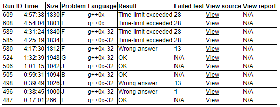 zhhhplus: 今天开场前十几分钟我跑去报到+尝试交图了(然后老师没来……),所以刚过来就看到签完了E题,接着问了一下有没有什么题是读了还没出解法的,然后感觉了一下J题是七月集训原题,和cyw随便讨论了一下认为可以先把负数搞正再做,cyw回忆一下就去写了。lsy这边B题跟我讲了这个二分图一定有一半点数小于等于20,然后枚举一遍,另一边我说直接相加依次相乘就行,接着我去看了一下G题,感觉枚举一下左右1的点,字符串hash一下,剩下的就是二维上加点求矩形并面积的事情了,线段树之类的维护一下就行(其实随便排序一下就行),跟cyw讲了,接着就尝试开A题F题I题,I题觉得大概后缀自动机维护一下,lsy表示l,r的问题可以类似前缀和,但是感觉我脑子里的后缀自动机有毒,好像根本不是后缀自动机,大概我以为的后缀自动机其实是个后缀trie,然后就不太理解为什么合并它会有点难,大概就导致它其实基本是lsy单开?F题我们一开始以为是O(nm)的,接着cyw发现是O(nm^2^),接着因为A开不出来,I在尝试改板子,决定先写个F再说,后来调完F题,本地测了个全0数据,只跑了1.2s,交上去却T28了。这次刷新了记录,1.5个小时之后就再也没过题QAQ。