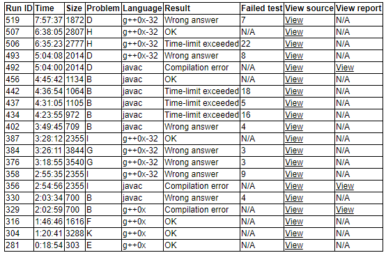 zhhhplus: 一开场我看了一下K题,发现是个三角形交圆的题,顺口问了一句cyw有没有板子,据说没有?随便列了7种K题的分类讨论,非常自闭,于是决定先放着。接着cyw告诉我E题好像是之前做过的原题,和我描述了一下题意,基本就是我之前补掉了的博弈DP,然后我去写了一下打了一下表,找了一下规律,写了一下交了过了。接着回头找别的题做,然后看到了G题已经被人过了,然后我就尝试找了一下三维凸包的板子,放弃了红书是因为好像少一个判断共面的函数不好处理?因为这东西行数还蛮多的而且还要自己处理一些东西所以有点自闭。之后发现大家纷纷过了K题?我就重新翻了一下板子,找到了多边形和圆的交这个东西,虽然有点杀鸡用牛刀,但是总是比我自己手写的靠谱的,于是我上去敲板子,lsy和cyw开别的题,然后cyw据说有了B题解法,lsy似乎开出了F题(似乎是一个我看了一下表示大概是拆成链DP的DP题?(迅速甩锅给DP选手lsy)),过了很长时间终于抄完了板子,改了几个错误(得到启示:红书跟在板子后面的Hint非常重要,Hint是好文明,HDU几何板子是坏文明),然后一发过了K题,lsy继续写F题,不久之后F题就过了,cyw似乎已经开始尝试Java写B题了?接着我们发现I题似乎可以做,我感受了一小段时间(第一步是随口说这玩意儿像割点,我觉得我随口说的习惯需要改一改),觉得应该二分图做一下匹配,如果能两次匹配成满的匹配就输出Yes,然后跟lsy讲了一下做法,觉得做法大科学。但是cyw在写B题,lsy在开D题(此前cyw和我提起过D题的做法,好像是什么倍增什么SAM的记不太清,但是他们似乎遇到了一点问题),但是我当时感觉这个东西可能得像昨天的网络流染色题那样做,暂时不太会,决定留给lsy或cyw来写,看到机器暂时是空的,于是决定强行打一发G题,在斟酌了一下之后觉得HDU有same()函数,决定抄HDU,然后刷新了我一场中打的代码行数的记录……之后基本就是在帮忙调错,抄板子,改代码的过程中度过了,还剩一个小时多一点的时候心态有点爆炸,对HDU充满了不信任(“相信自己的卡牌”),因为大家手里还塞着D题I题和B题,决定把G题放弃掉。然后我们让cyw重新读一下自己I题的代码(因为再想了一下,结论(建图)绝对没有错),接着发现是n和m打反了,于是我们把cyw打了一顿(雾)之后过了I题。接着就是lsy调D题和cyw调B题了,B题改了一点小错之后觉得好像改不出什么bug了,交上去试了一下结果获得了WA?然后我来听cyw讲他B题的做法,发现cyw没有把n*p给计算进去,让cyw改了一发之后T16,cyw此时提出要换C++高精度板子,我按住了他,表示这个点T掉了一定是复杂度在哪里爆炸了,让他好好想想,然后cyw思考了一会儿之后决定记忆化求阶乘(emmmmmmmm),然后改了一发T5,我一脸懵,表示让我康康这个代码,发现阶乘是用BigInteger来存的,表示改成int看一下吧,然后T18,我表示你再想想你的复杂度有没有问题,然后又过了一段时间之后cyw表示是有问题的,也能改了,上去写了个欧拉函数(cyw:是欧拉定理!),把复杂度又降下来了,交上去才过了。还有20+分钟,lsy在机器上写D题,WA8收尾。