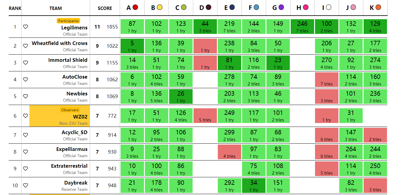 开场读题,jj从前往后,xx从后往前,fby就xjb乱读。jj发现A可做,去写A,zlj A1(12) xx觉得K可写,fby觉得J可做,但是由于我们没有几何选手就不会做J。xx上机写K,挂了。fby发现G题有人做,读题,可做,将xx赶下来,写一发G, fbyG2(68)。xx学长调试了一会儿K,这个时候fby和zlj手里有F和B,再次赶下xx, fby F1(87), zljB2(95)。在jj学长写B的时候fby发现了C题只要暴枚既可以了,fbyC1(106)。 我们发现全世界都过了J只有我们不会,jj学长推了一万年式子当场死亡,xx学长机制的提出暴枚角度,fby和zlj表示怀疑,后来想想觉得hin有道理,写了一发fbyJ3(147),由于忘记删掉文件操作挂了两发。 之后我们就在E、I、K上徘徊,jj学长写E,fby和wxx开出I,然后fby和zlj轮流写E和I,E没过样例,I TLE。在最后的半个小时里,陷入了摸鱼的状态。好在jj学长在比赛结束前两分钟把E调对。 zlj E2(299)。