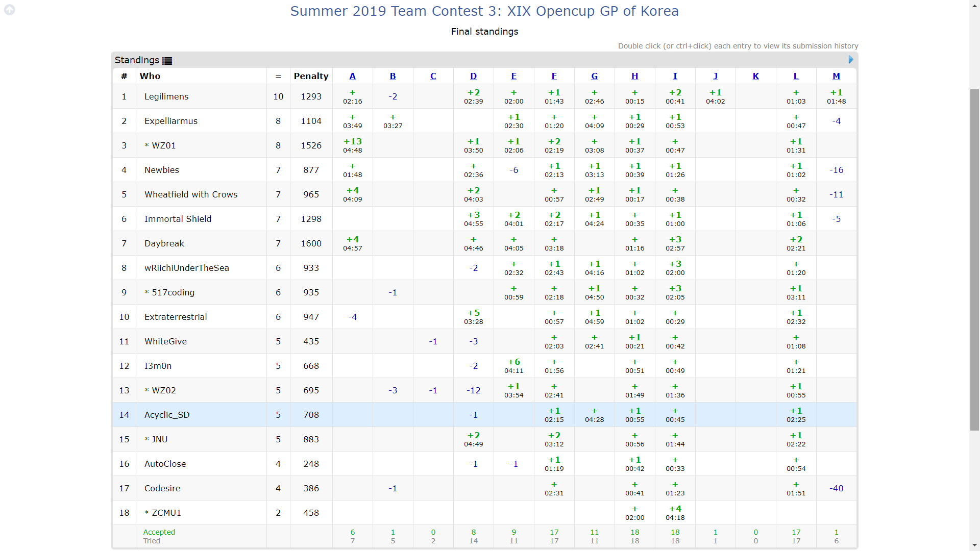 按照以往的读题顺序,jj从前往后,xx从后往前,fby挑短的读,看到了I,感觉可做,但是想想有不太会,后来大家都把这个题过了,fby啥啥的推性质,xx说你直接把所有SG函数值搞出来就得了,fby想有道理,去写了。fby '''I1(45)''' 。并与此同时,fby把jj坑去做C了,浪费jj巨多时间,跟榜写H, wxx'''H2(55)'''。然后我们就突然陷入僵持,大脑短路没题可做,基本上在这个时间把所有能读的题都读的差不多了。这时候fby发现根本没人过C,就把zlj拉下去做L,然后xx学长继续读题。之后fby看了一眼hr队的榜,他们早就过了F,于是看了一眼题,sb构造,但是由于少看一个条件,挂了一发,而且调了一会儿,这个时候jj会了L,于是她写L我调F。 fby '''F1(135)''' zlj '''L1(145)'''。 然后我们就再次陷入漫长的沉寂,还剩一个小时十分钟的时候,fby觉得这样不行,就挑了一道题,让三个人都想G一道题,然后zlj不负众望,开出来了,fby与zlj石头剪刀布决定谁去写,fby输了,坐在机上写了三分钟,zlj:“其实我写也行”,fby:“那你写”,zlj:“那我写”。fby快乐摸鱼。 zlj '''G1(268)''' 。然后fby和zlj讨论出了D题的做法,但是只剩20min,zlj最终还是没有写完。