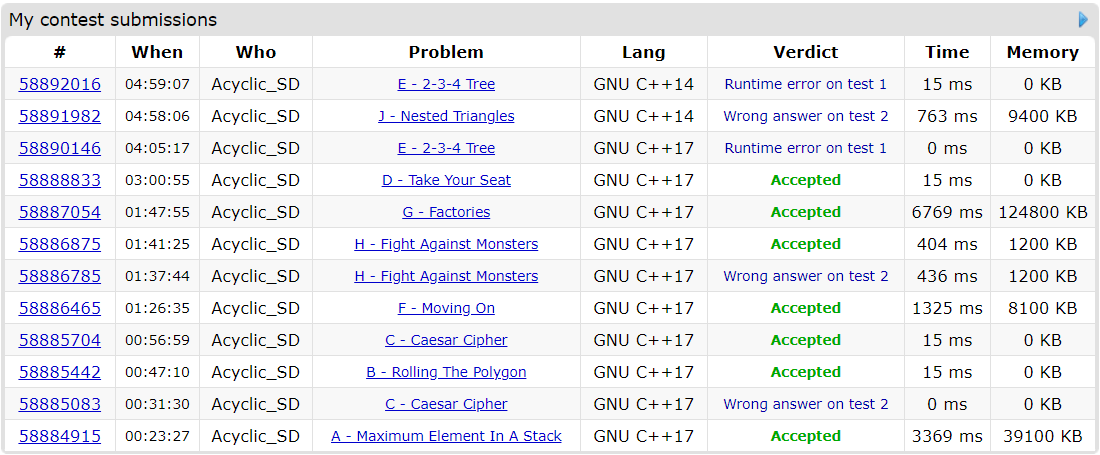 我从三个小时开始写E,写加调试一个小时,交上去居然RE,什么擅长数据结构,都是假的,初始化没初始化明白都没发现,而且我还是指针党,队友不太熟悉指针,想帮我查都比较费劲。
