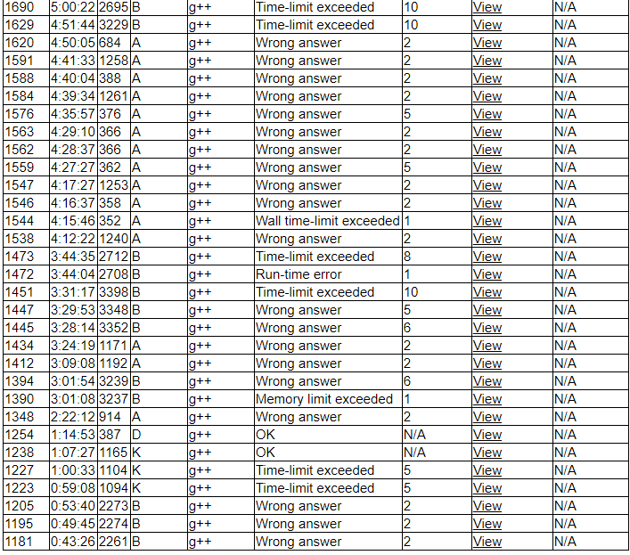 发生了一些让心情很焦虑的事情,做题的时候精神不集中,签到题很长看了很久,后来看到E题只想老老实实推E的式子,结果花了很多时间之后,fby告诉我式子一直按照错误的题目推的,gg。过程中考虑过开别的题,一些题目一看没思路也就没细想,发现式子退推错了之后扔了看别的题,发现C快出了,考虑时间问题弃疗处理,最后决定一起搞A,五花八门的乱搞算法还是搞不过去啊……最后直接自闭处理了……这两天精神也不是很好,越来越自闭了……