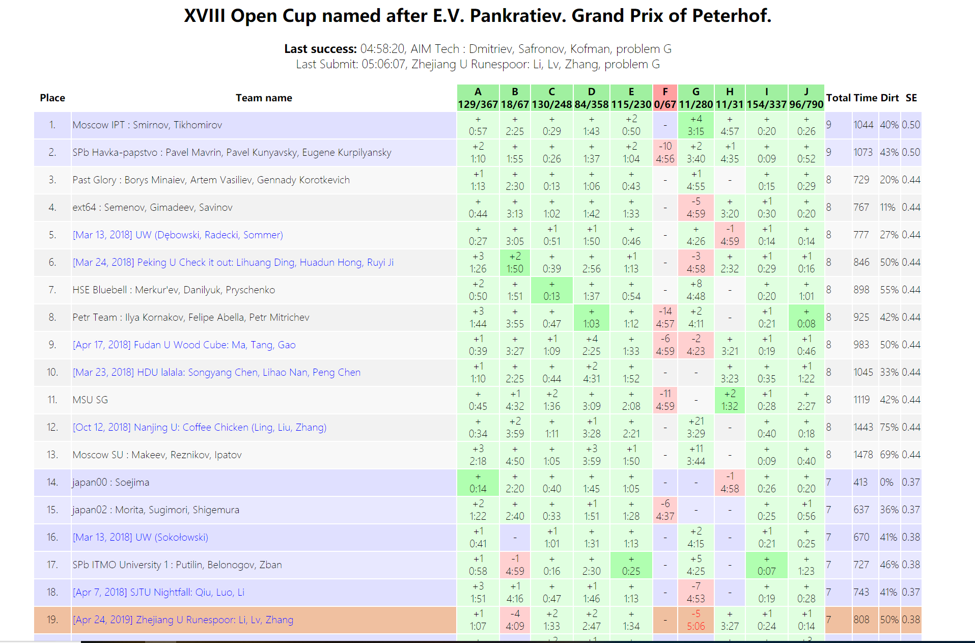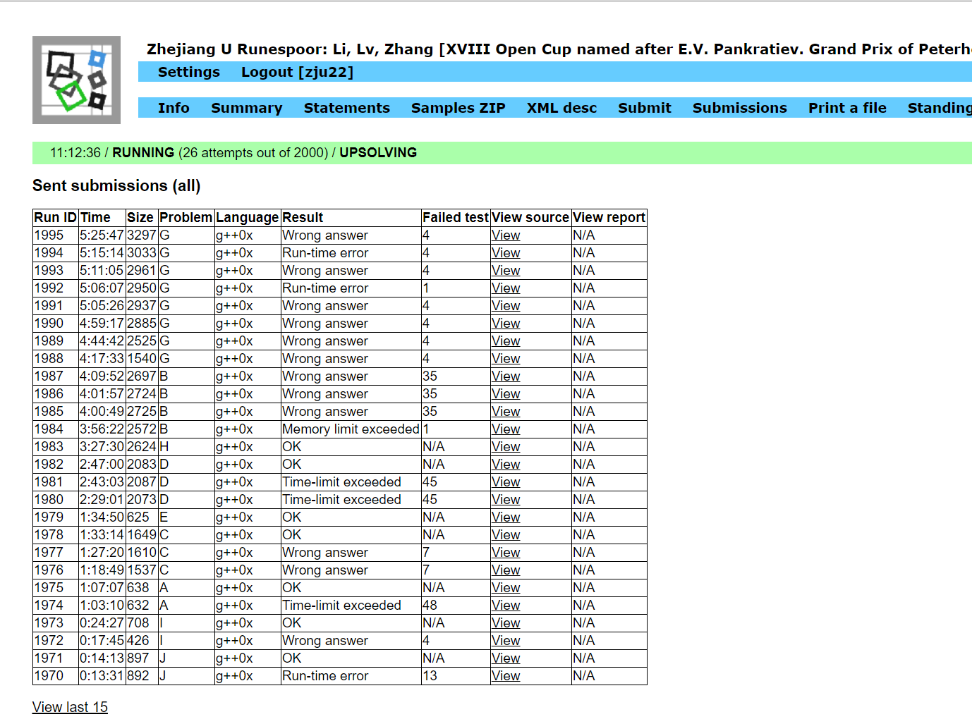 zqq: 前期我们的节奏还行。但是后期非常惨!heltion的H很稳的过了。而我的B题因为姿势不足想了错误的做法。'''对于轮廓线DP的技巧认知非常不足,根本没有往颜色插头上面想。然后以为比较简单,所以就相信了一个错误的结论。写完因为轮廓线DP太不熟悉,还调了很久,最后WA 35,以为写错了,其实自己的做法完全是错的。'''