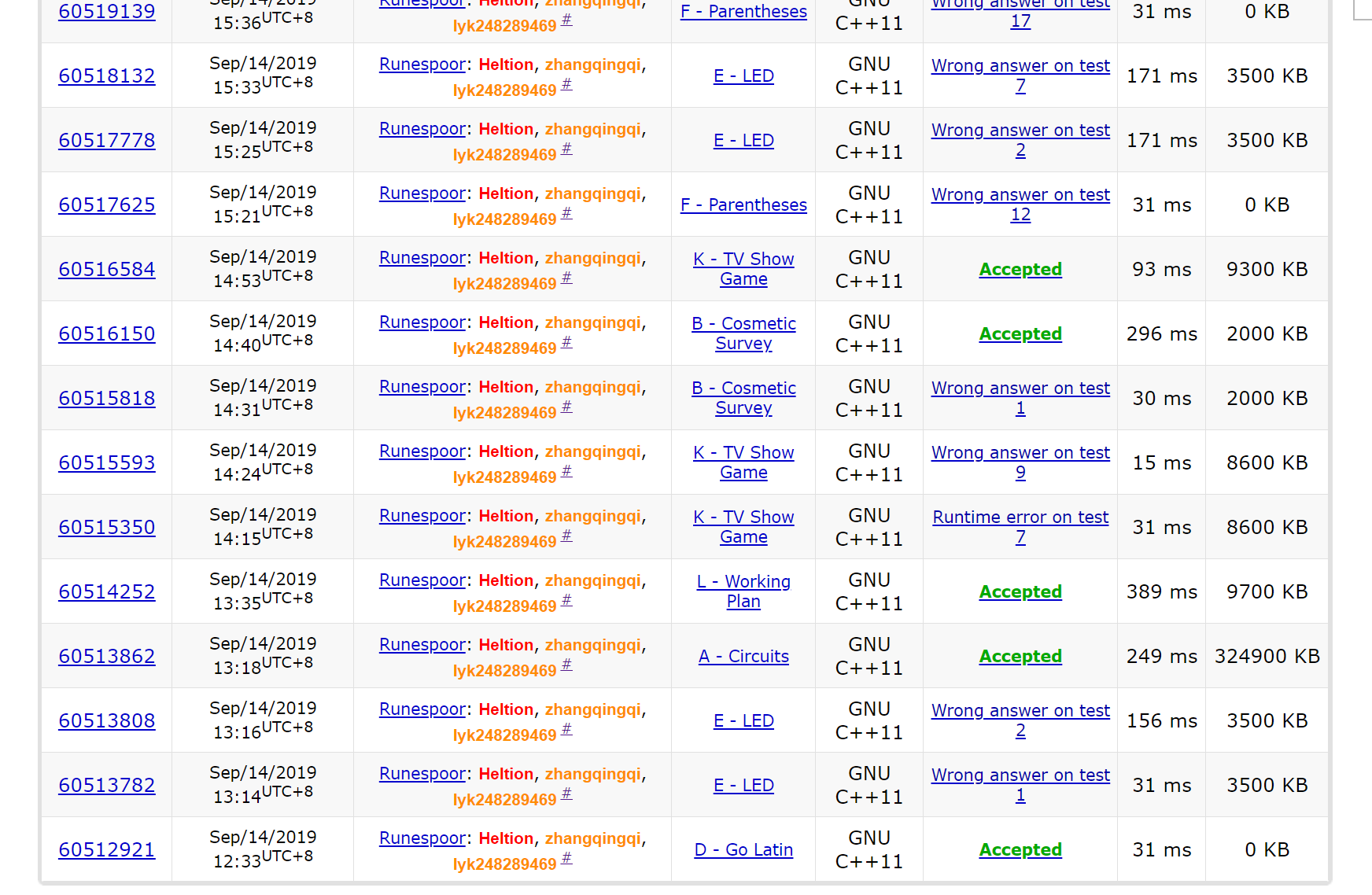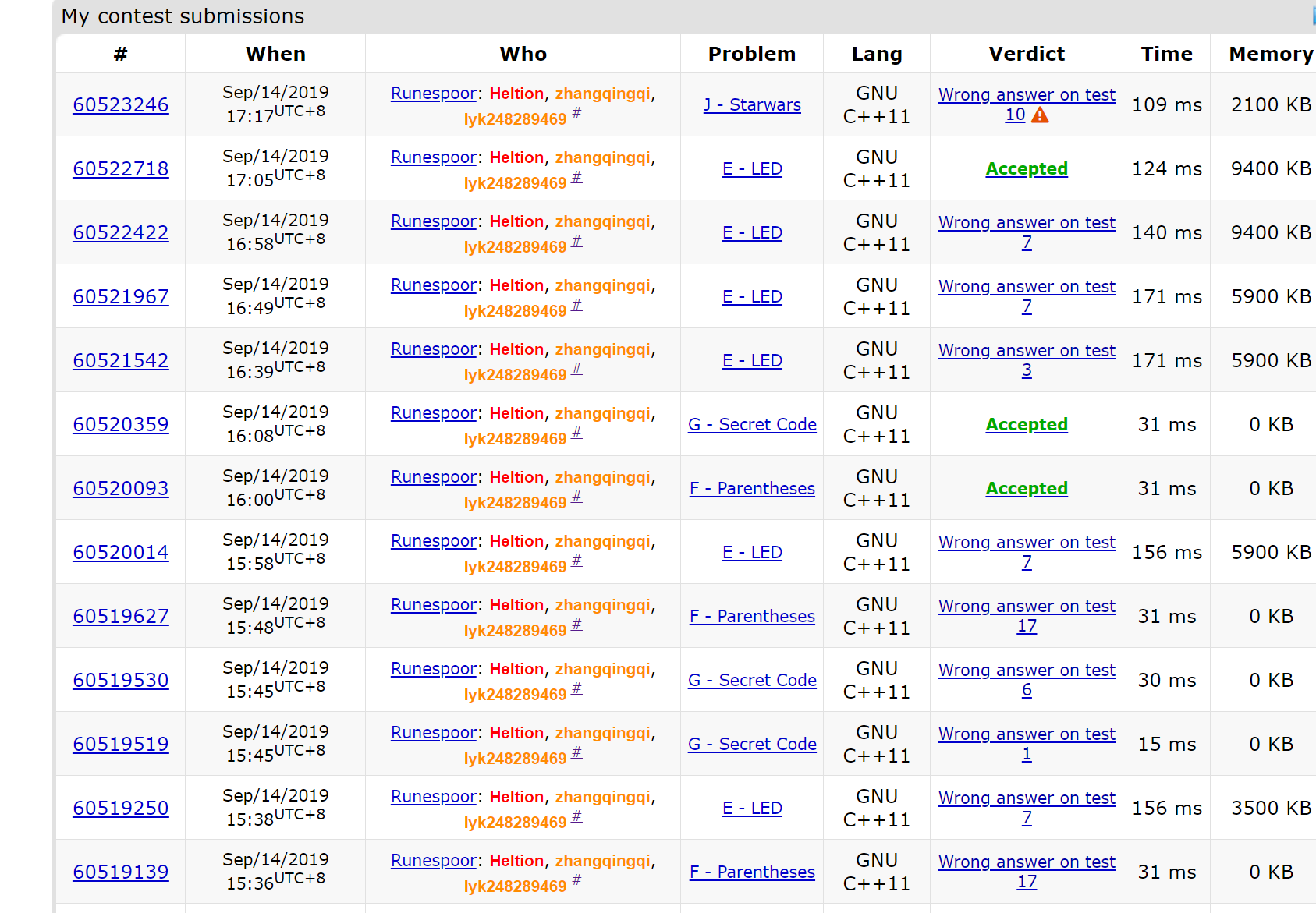 zqq: 整场都在签到。这场题目有corner case,比如E题,一直没有发现,代码换了几种写法(我测过最开始的每种写法加上特判0都是对的)。感觉后来调题调得头非常晕。