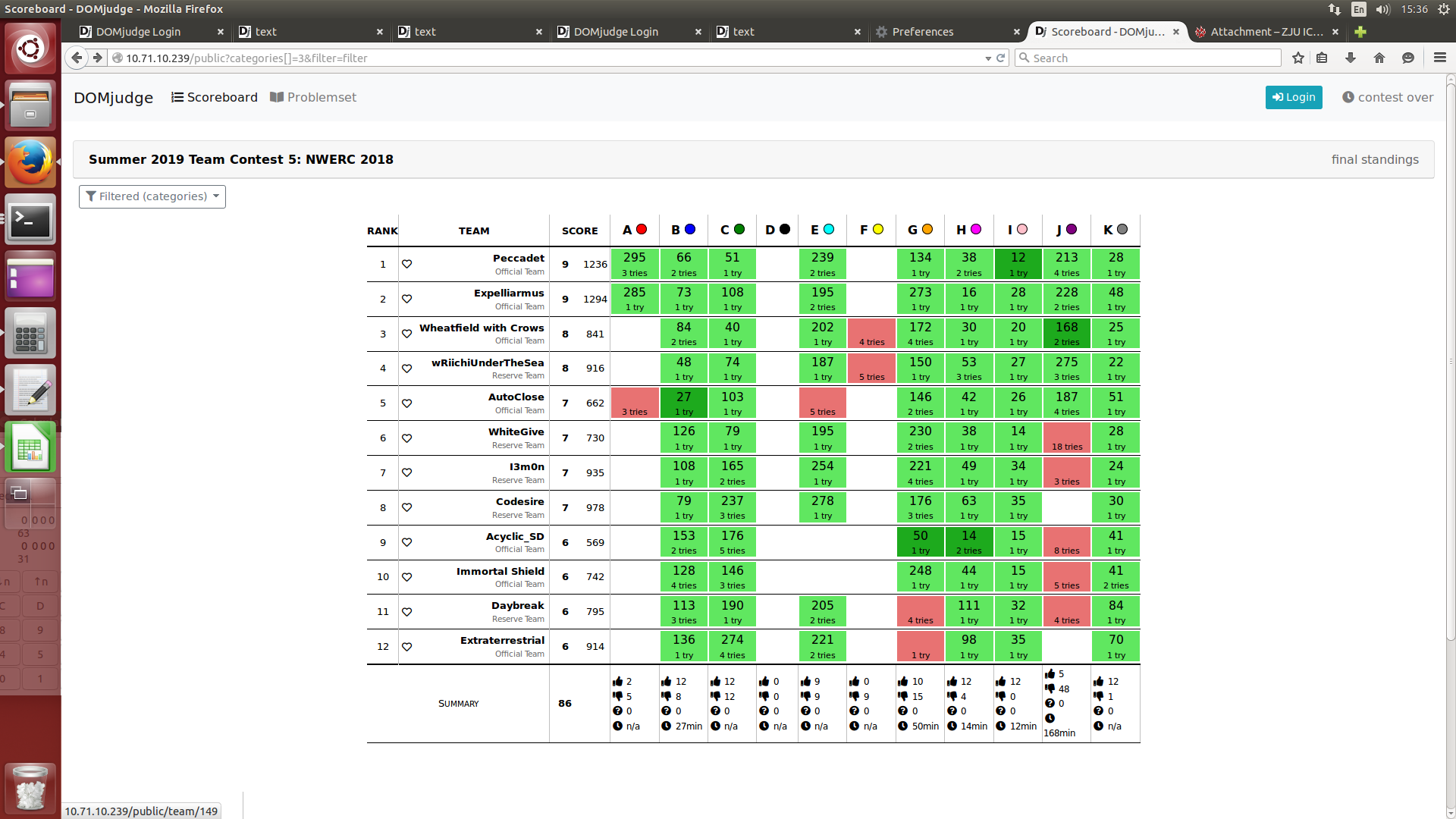 样例没啥问题,也没去读题,一直对着代码debug,中途和miner轮番上机,miner找到了错,换了个写法a掉。G248(4),之后30min左右,还是觉得看J比较正确,放下了E,J调到最后,赛后发现和其他几个没过的队一样题意错了..[[br]]