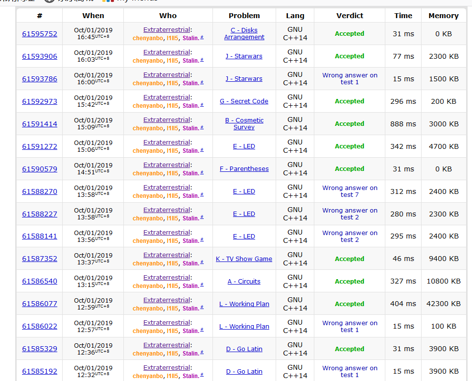 10月1号的训练,是这么多场一来发挥最好的一次了,最后结果比好多比我们强得多的队都要好,甚至在3:44~3:58的时候踩了浙大最强队Legilimens... 最后跟他们比实际上慢在F这个大模拟上,但这也不是很有办法,一发过已经算理想了。几乎和暑假集训某天踩了学军由三位国集组成的某个队半个多小时一样爽。不过我被胜利略微冲昏了头脑,队友3:44过J后,C题写一个算法我写了超多打错的地方浪费了半个小时,还好运气好调完交上去一发过了,不然要是最后时间不够我又得背锅了不过身上锅这么多,多bg一次少bg一次也没啥的。希望下个月能有差不多这样的发挥。