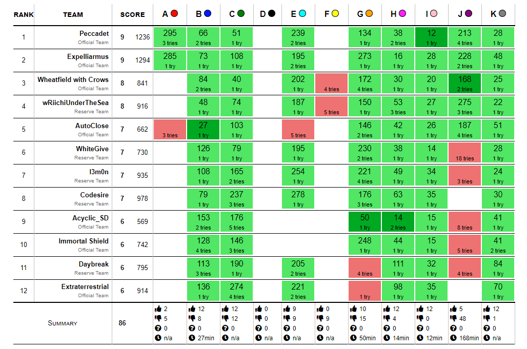 sds出门签了一个I1y12,队内全榜一血。lcd交了K1y28,lcd:“我读了二十分钟题.......”做完K,lcd跑去开F,发现是个最小树形图,掏出校板一看复杂度过不去,开始尝试利用题目性质魔改。sds交了H,很长时间返回了一个WA。然后又交了H2y38。lmh随后想出了C,C1y51。做B的时候,sds想起了上一场的题,然后该调用数组dp的地方写成了调用数组d,WA了一发(sds也不知道为什么能过样例)。1h时lcd弃疗了,丢下F去开其他题。sdsB2y66。lmh上机写J,sds和lcd讨论了一下G,lmh觉得J很难写,就下机让sds来写G,拉lcd过来讨论J。开始lcd出了一个也不好写的做法,后来lcd做了一个转化,把做法改了一下,降低了不少编码复杂度。sdsG1y134。之后lmh继续上机写J,写完WA了,lcd把手里的E丢给sds跑去和lmh看代码。lcd指出了lmh会爆longlong,交了一发又WA了,lcd和lmh陷入自闭,开始乱搞。lmh写了一个对拍,发现完全ojbk,无奈改成__int128试了试,依然WA。lcd弃疗去想A,之后lmh一拍大腿,发现题意假了,J4y213。sds对着E挠挠脑袋,E1y239。lcd和lmh讨论出了A,lmh先写了一发,WA了,换lcd上去写,也WA了,lmh出了一组数据hack掉lcd的代码,lcd改完后A3y295。