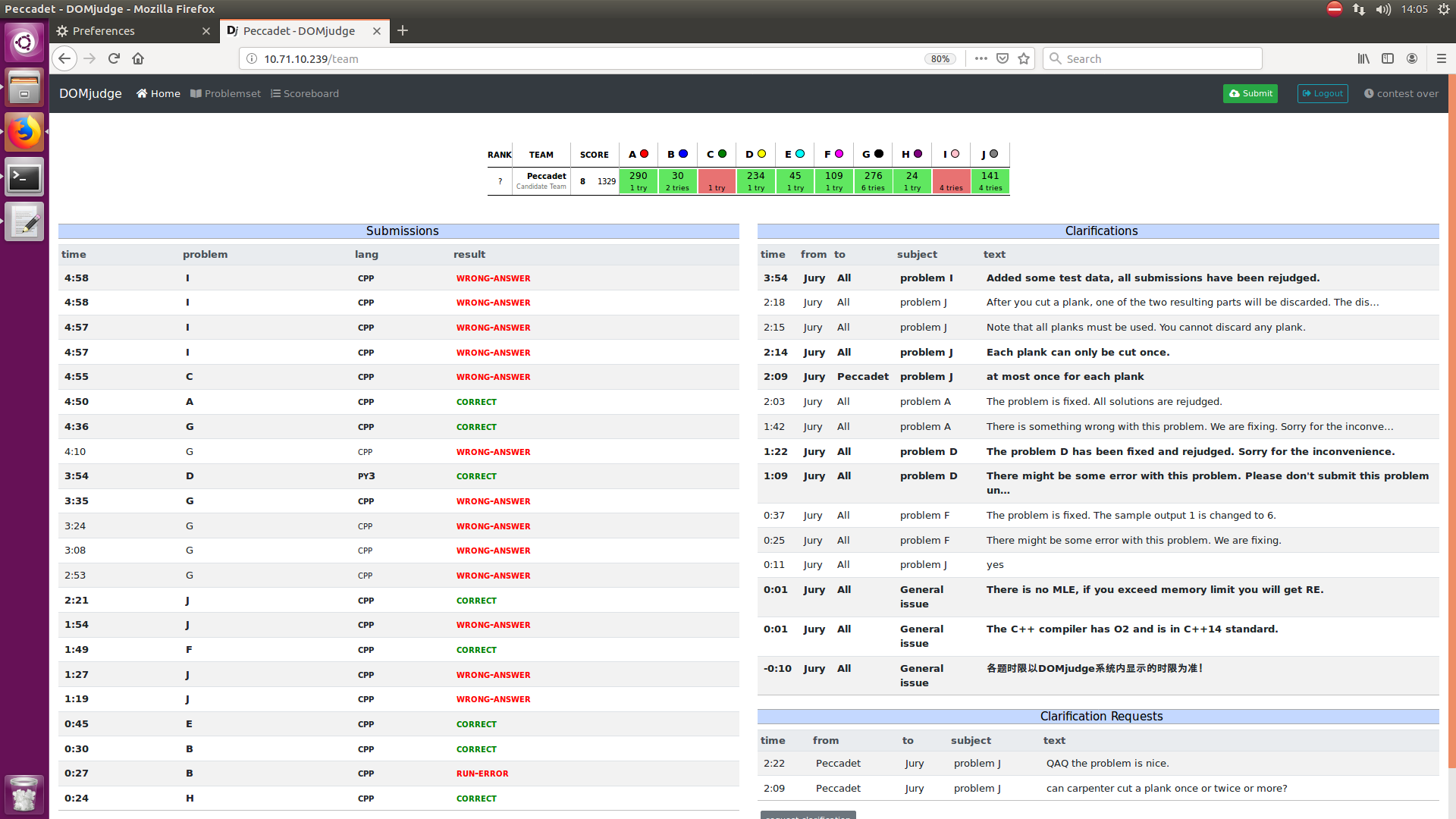 开场各自看题。lmh上机签H,H1y24。sds上机签B,RE了一发,B2y30。lmh上机签E,E1y45。lcd看A题有一些思路,于是先上机写,写完发现怎么都过不了样例,换sds写J。sds由于细节问题WA了两发,换lmh上机写F,F1y109。sds又WA了一发,于是找lmh讨论。lmh发现题意有问题并发了clar,得到的一系列回答将题意解释清楚了,J4y141。lcd发现自己的A题假了,弃疗看C。lmh和sds讨论后上机写G,sds看D。lmh写完G并获得了若干发WA。lcd不会C,于是和sds讨论D,发现是一个excrt,但是三个人都不会。lcd翻了红书和zju板子都没有找到excrt,sds拿了自己的板子下来,总算是找到了。lmh交了4发WA后下机理一理,顺便指导了sds用python如何输入,D1y234。sds看了lmh的G题代码后指出了一个小错误,但是依然WA。sds表示自己上,lmh和lcd讨论C,得到了一些想法,但是没有结果,于是lcd打算捡起自己的A再看看。sds一发过了G(lmh: ???),G6y276。lcd修正了自己A题的思路,A1y290。