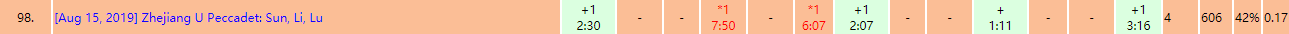 开场各自看题,没发现有特别签到的题目。sds看D,lcd开出A,写了一发WA,随后被抬走了。sds读完J喂给lmh,'''J1y71'''。sds继续看D。lmh看着G没有想法,sds读完G给了lmh一个idea,于是lmh迅速得出做法,由于xy没有交换WA了一发,'''G2y127'''。随后lmh看M,sds丢掉D,捡起lcd的A看了看,'''A2y150'''。lmh上机写M,由于数组开小WA了一发,'''M2y196'''。sds把D丢给lmh想,自己开E。sds写出代码却没有过样例,发现自己做法假了,又捡起D。lmh看D没有一点想法,丢掉去看其他题。还有30min的时候lmh开出F,不久sds开出D,但是都没有写完。