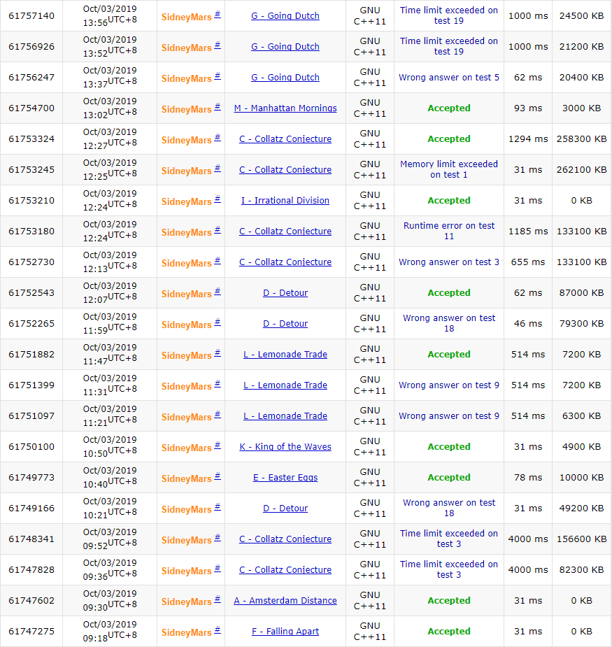 开场各自看题。lmh看到A觉得很easy,就冲了上去,写完没过样例,觉得没有那么简单,于是先下机推式子,让sds写F,F1y18,A1y30。sds看了C觉得是个原题,写了3个log的做法,果然T了,lmh看后优化掉一个log,同样T掉,sds决定先将这题晾在一边。此时两人得到了来自lcd的场外援助DG,lmh上机写D,WA18。sds连续开出EK两题,E1y100,K1y110,但是lmh还是没有查出bug。sds听了做法,看了看lmh的代码,觉得无比正确。lmh开出L题,写完WA了两发,lmh三开三WA,sds不禁怀疑lmh是不是来打假赛的。lmh在讲做法的过程中渐渐修正了问题,L3y167。sds决定自己上D,同样WA18,lmh顿时心里好受了许多。很快sds就把D给过了,D3y187,并表示lmh写了个假做法。lmh打算捡起C,把unordered_set改成sort+unique后WA了,lmh表示自己的复杂度没有问题,开始查代码。sds开出I,I1y204。lmh重写了一个好看的链表,在数组大小上分别得到RE和MLE后终于改对,C6y207。lmh开出H,他抱着"赛后一定要写出来"的想法上机去写,期间sds开出M,M1y242。sds觉得lmh不靠谱,捡起lcd留下的G并把lmh拉下机,最后并没有写出来。
