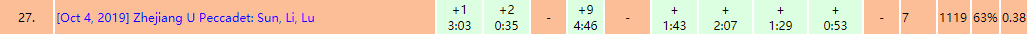 开场各自看题。lcd出了B,lmh听完觉得非常OK,然鹅lcd由于没有判errorWA了一发,又由于没测样例WA1一发,'''B3y35'''。lmh开出I,'''I1y53'''。三人看过H,一致认为应该本地打表,sds先写了一个很裸的搜索,一直没跑出来,之后lcd加了几个剪枝,很快就跑完了,'''H1y89'''。三人看F,sds先写了暴力得出前面几组解,lcd敏锐地找到了规律,'''F1y103'''。lcd开出G,和sds讨论后上机写了,'''G1y127'''。lmh开出A,并表示他不会写,sds决定让lcd上机写,lcd得到了一发WA,sds指出应检查边界数据,lcd随后调过了,'''A2y183'''。lmh看了D,给出了一个假做法后转头看J。sds看了J,表示看不太懂后与lcd研究D。lmh看完J表示他想写,sds觉得他不靠谱就没让他上机。lcd想了一个大力贪心,得到WA30,sds写了个大力搜索,调参过程中一直在WA与TLE间反复横跳,而此时lmh已经睡着了……快结束的时候,lcd想出了第二种贪心,加上去就过了,'''D10y286'''。