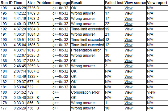 开场各自看题。lcd出了B,lmh听完觉得非常OK,然鹅lcd由于没有判errorWA了一发,又由于没测样例WA1一发,B3y35。lmh开出I,I1y53。三人看过H,一致认为应该本地打表,sds先写了一个很裸的搜索,一直没跑出来,之后lcd加了几个剪枝,很快就跑完了,H1y89。三人看F,sds先写了暴力得出前面几组解,lcd敏锐地找到了规律,F1y103。lcd开出G,和sds讨论后上机写了,G1y127。lmh开出A,并表示他不会写,sds决定让lcd上机写,lcd得到了一发WA,sds指出应检查边界数据,lcd随后调过了,A2y183。lmh看了D,给出了一个假做法后转头看J。sds看了J,表示看不太懂后与lcd研究D。lmh看完J表示他想写,sds觉得他不靠谱就没让他上机。lcd想了一个大力贪心,得到WA30,sds写了个大力搜索,调参过程中一直在WA与TLE间反复横跳,而此时lmh已经睡着了……快结束的时候,lcd想出了第二种贪心,加上去就过了,D10y286。