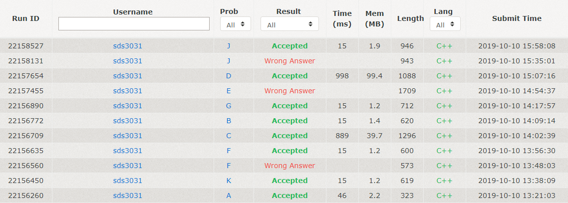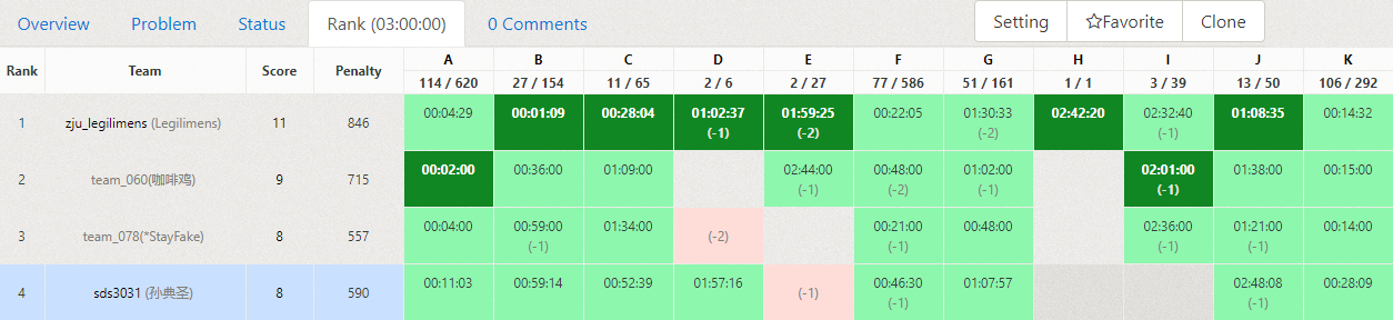 开场各自看题,发现cjb光速过了B,十分迷惑。lmh上机签A,A1y12。sds上机签K,K1y29。lmh想上机写BC,但是lcd开场看B到现在都没有出,sds觉得不太对劲,于是让lmh先验一下样例。lmh发现自己读题漏了一个条件,做法假了,但是C题做法没有问题,上机写C。lmh写到一半换sds写F,F2y47。lmh很快写完C,C1y53。此时lcd开出BG,上机写B并把G做法讲给sds,B1y60,G1y68。lmh开出E,sds表示让lmh先上机,自己读完E后和lmh交流做法并确认了细节。lmh写完WA了,此时lcd开出D并光速AC,D1y118。sds和lmh一起查代码,但看了很久也没找出问题。lcd看了E,同样想出一个做法,sds听完觉得两个做法本质上是一样的,问题出在代码上,但还是找不到问题。lcd开出J,J2y169。sds和lmh对着一份无比正确的代码看了1h,最终都没能找到问题。
